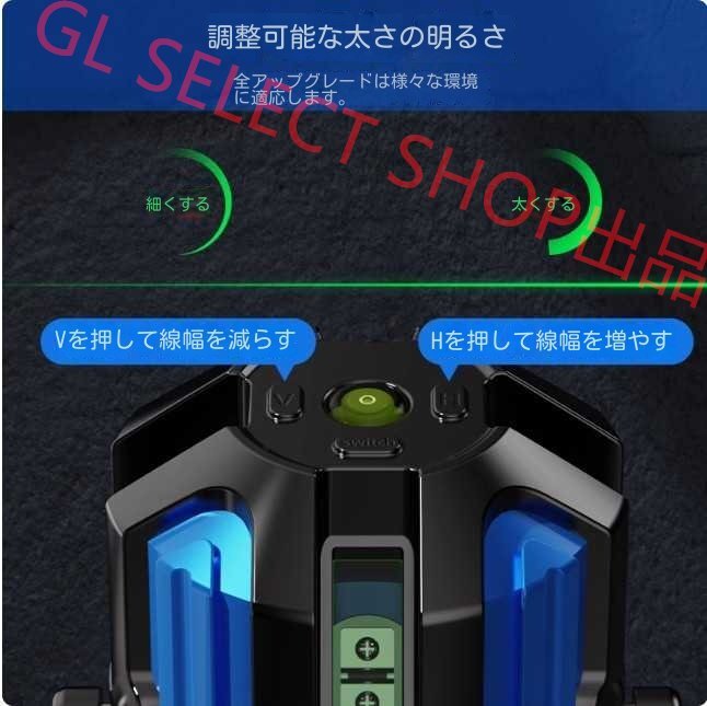スイッチの機能:「H」水平線、「V」垂直線、軽量コンパクトで使い易く、水平ライン、垂直ライン、クロスラインなどが効率良く出せます。