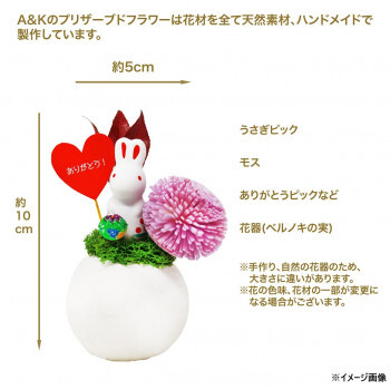 | お手入れなしで美しい状態を保つことができるプリザーブドフラワーです。かわいらしいうさぎピックがデコレーションされています。ありがとうピック付きなので、感謝の気持ちを伝えたい贈り物におすすめです。花器はベルノキの実をくりぬいてつくりました。 ※手作りのため、大きさに違いがあります。 ※花器は果実をそのまま使用しているので、大きさは不揃いです。 ※花の色味、花材の一部が変更になる場合がございます。 |
