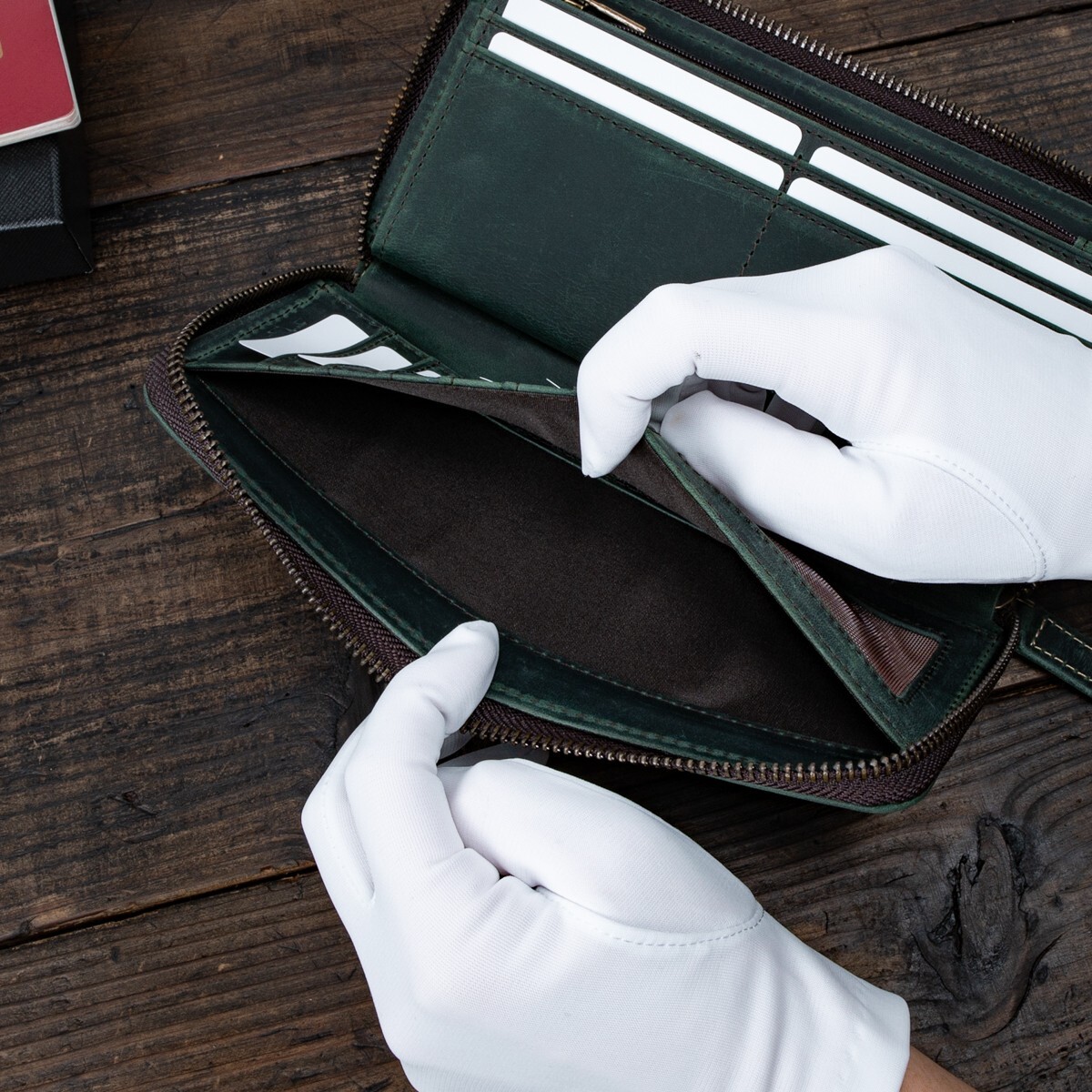 イタリアンレザーの中でも手触りの良さと経年変化が特徴のオイルドヌバックを使った長財布です。「ヌバック」は起毛革のことで、ヤスリで革の表面をこすって毛羽立たせています。