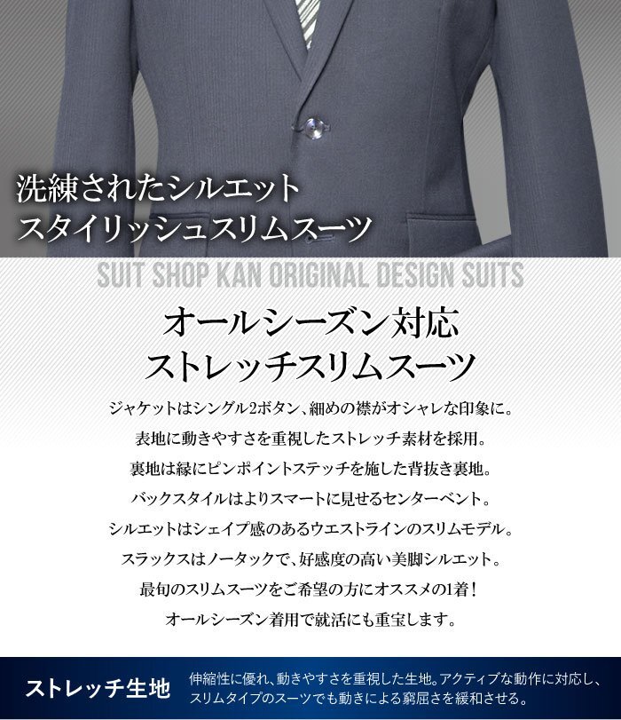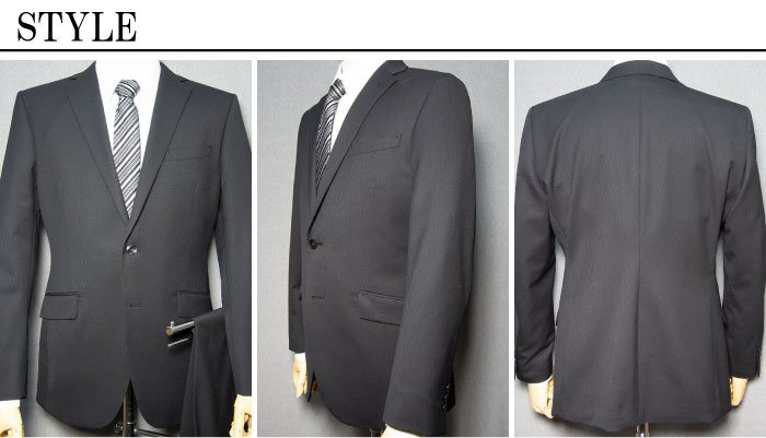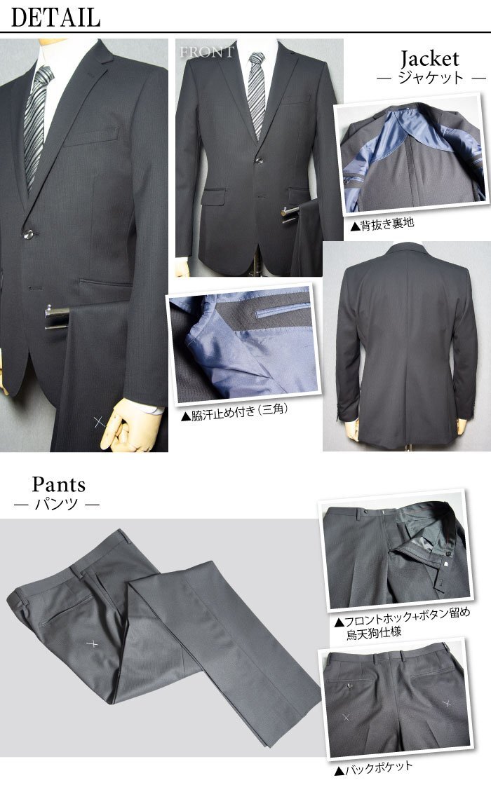 | ジャケット | シングル2ボタン 細めラペル 背抜き裏地 センターベント 袖3ボタン ボタンクロス留め ピンポイントステッチ Dカン留め 汗止め付き(三角型) お台場仕立て スラントポケット |