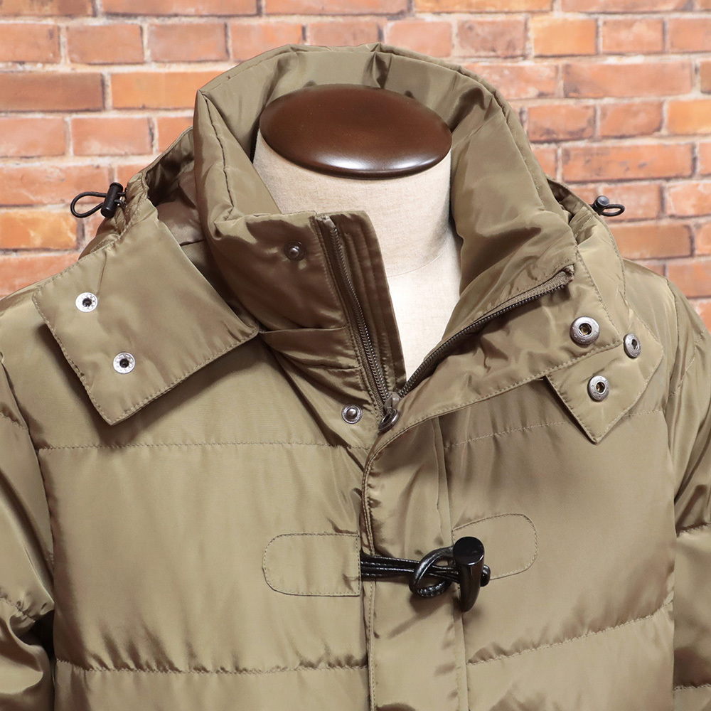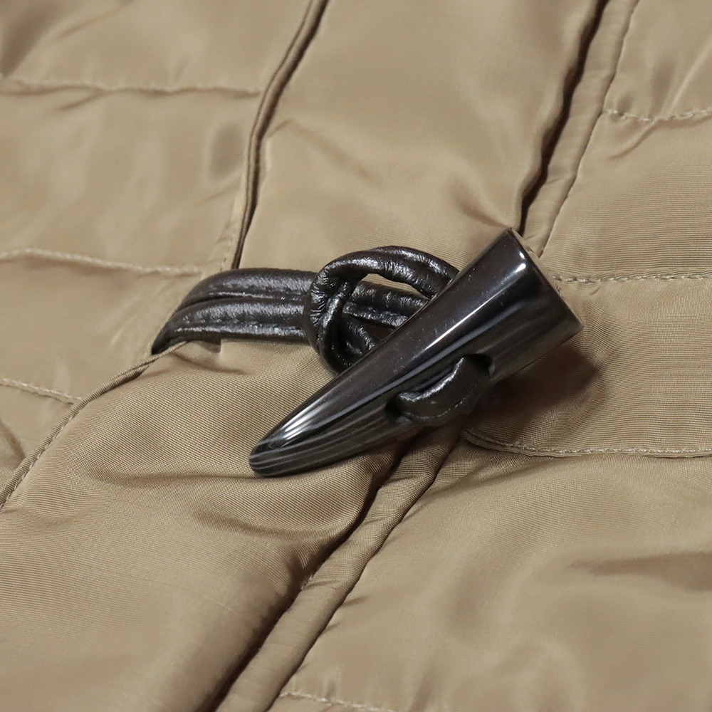 クラシカルなダッフルデザインに、ダウンの暖かさを組み合わせたハーフコート。上品なツヤを持つポリエステル生地を使用し、洗練された大人の雰囲気を漂わせます。