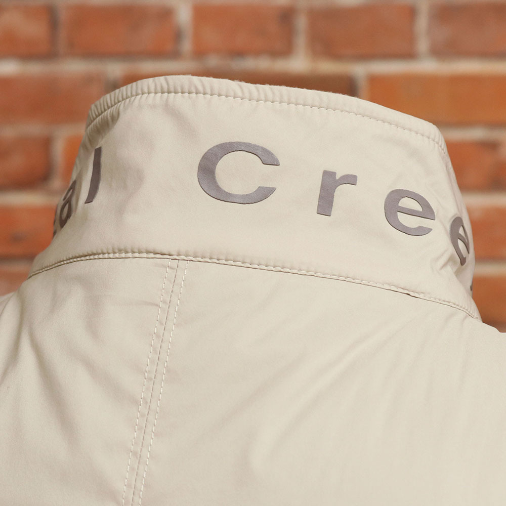 衿の内側には肌触りの良いフリース素材を施し、首元を暖かく包み込みます。衿にあしらわれたロゴと右胸のファスナーポケットが、スポーティさとデザイン性をさりげなく引き立てています。