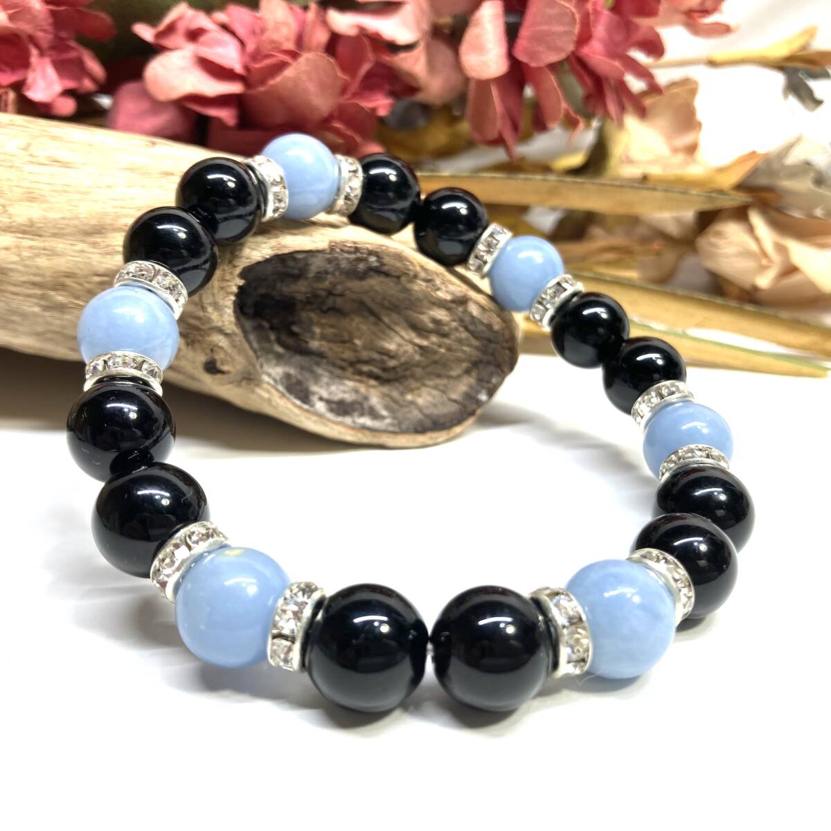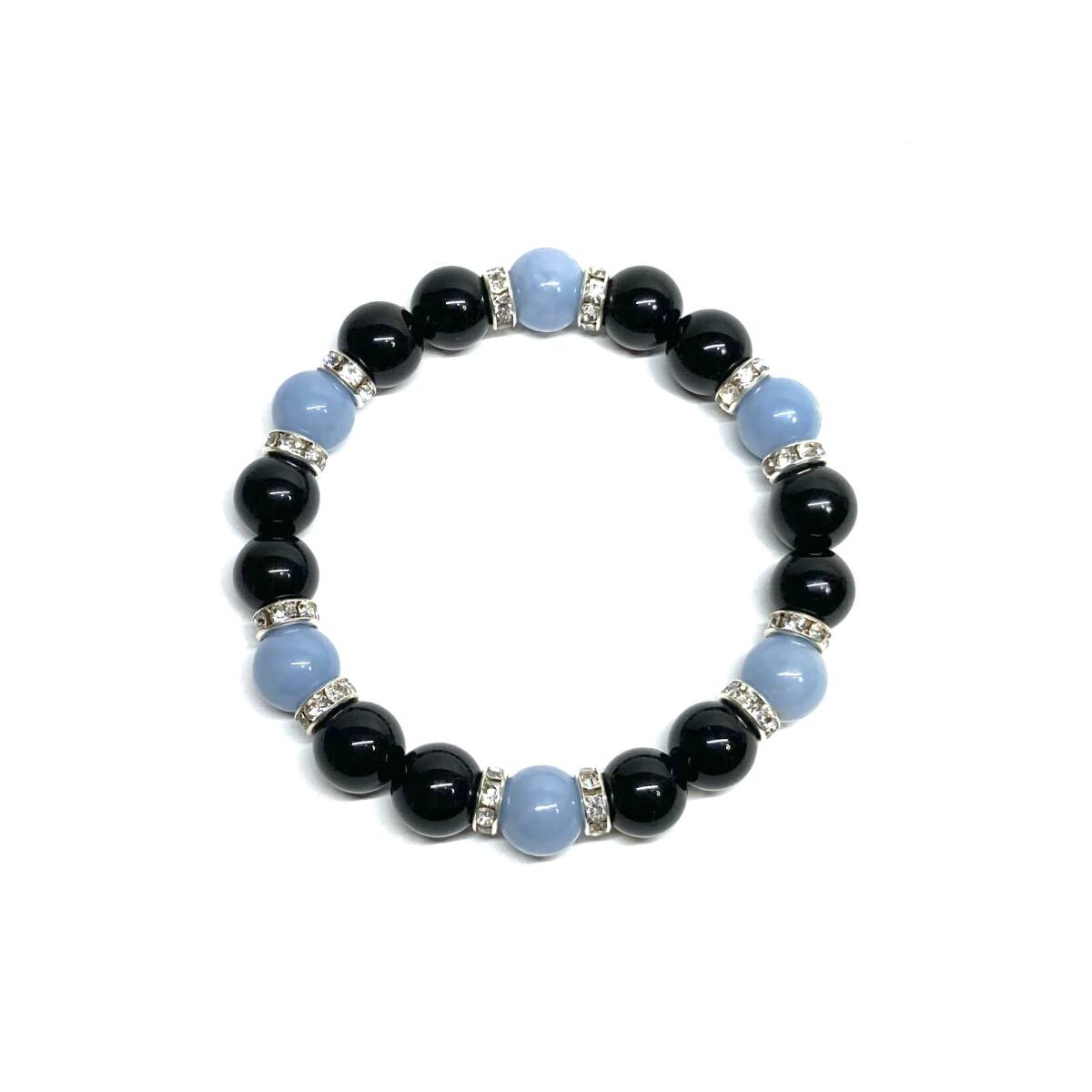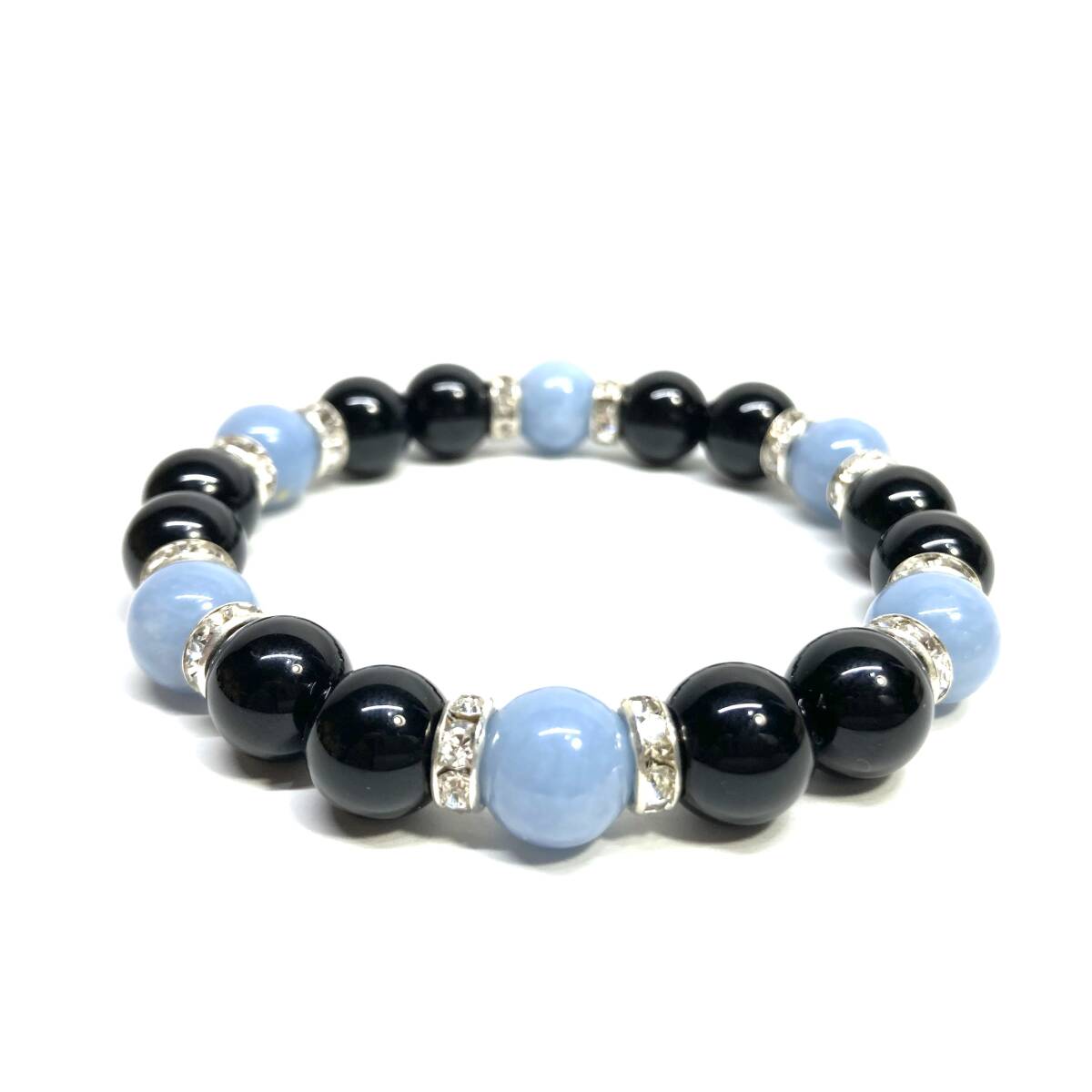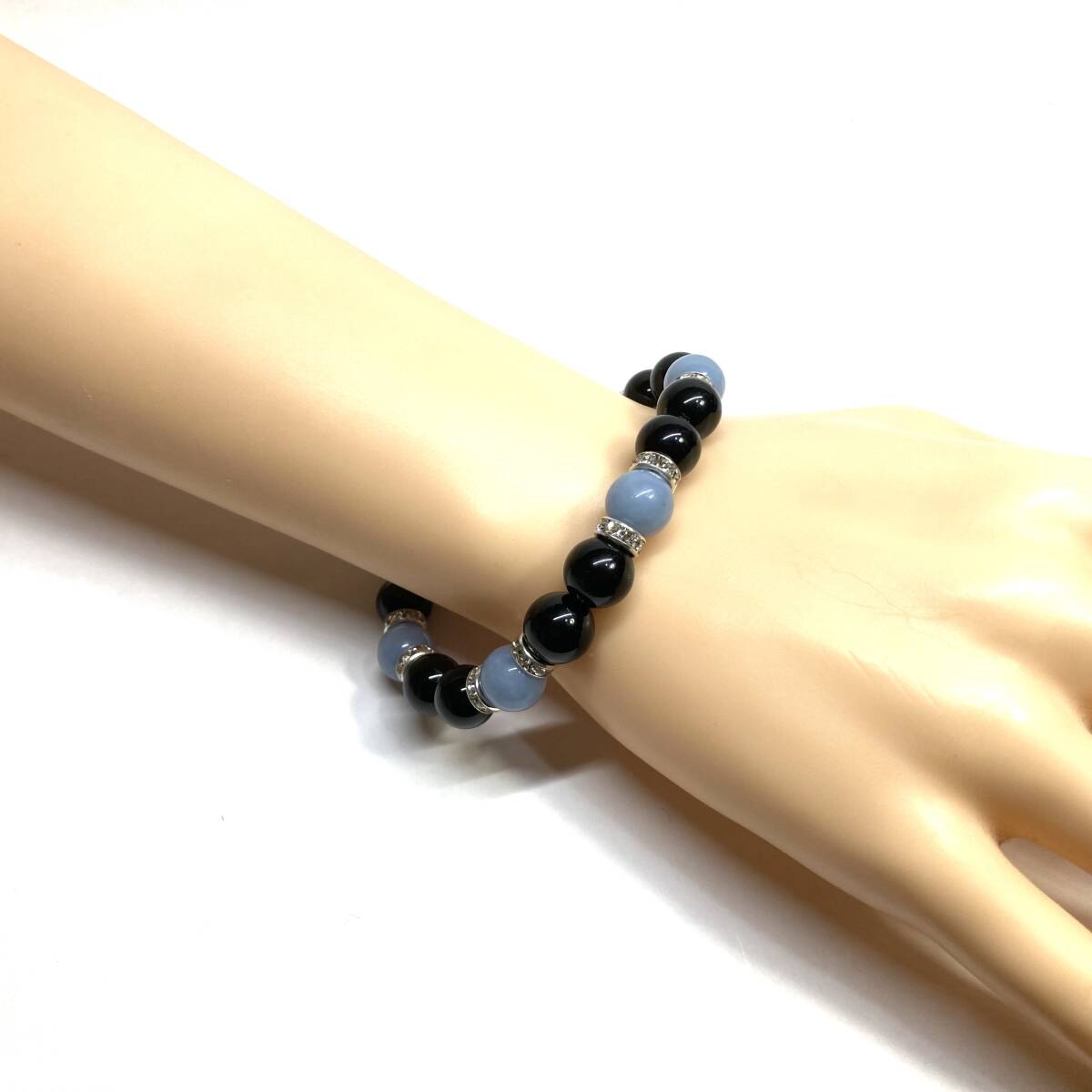 こちらは、モリオンとエンジェライトを組み合わせたパワーストーンブレスレットです。間にはロンデルを挟み高級感あるデザインに仕上げております。石大きさは腕にも馴染みやすいように10mm玉で内径約18cm(伸可能)です。(サイズ変更の場合は取引ナビにてご連絡をお願いします。) 数に限りがございますので気になる方はお早めにどうぞ。