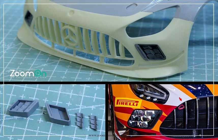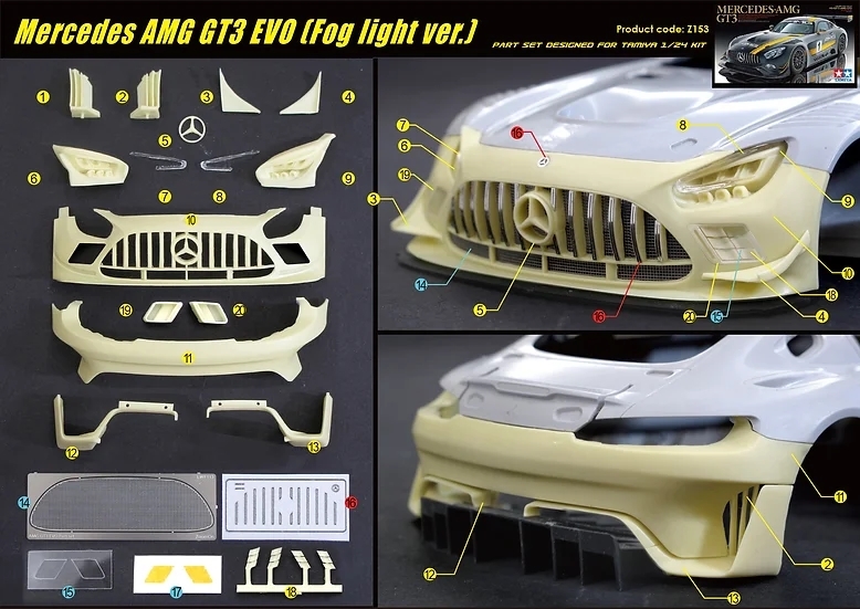 ZoomOn Z153 1/24 Mercedes AMG GT3 EVO (Fog light ver.) - Designed for Tamiya kit. - Designed for Tamiya 1/24 kit. -- Total 19 parts -- 1 set of metal sticker -- 1 set of PE -- 1 pc fog light masking tape -- 1 pc transparent sheet