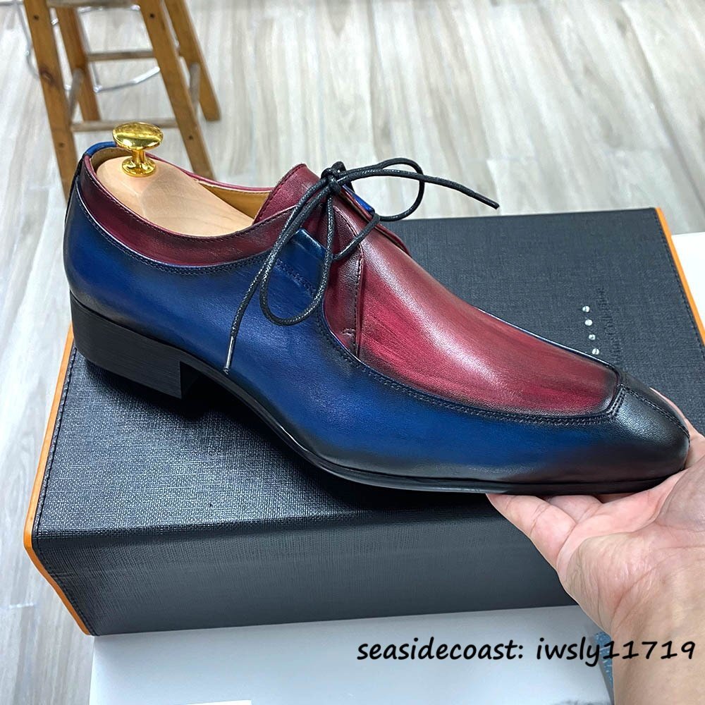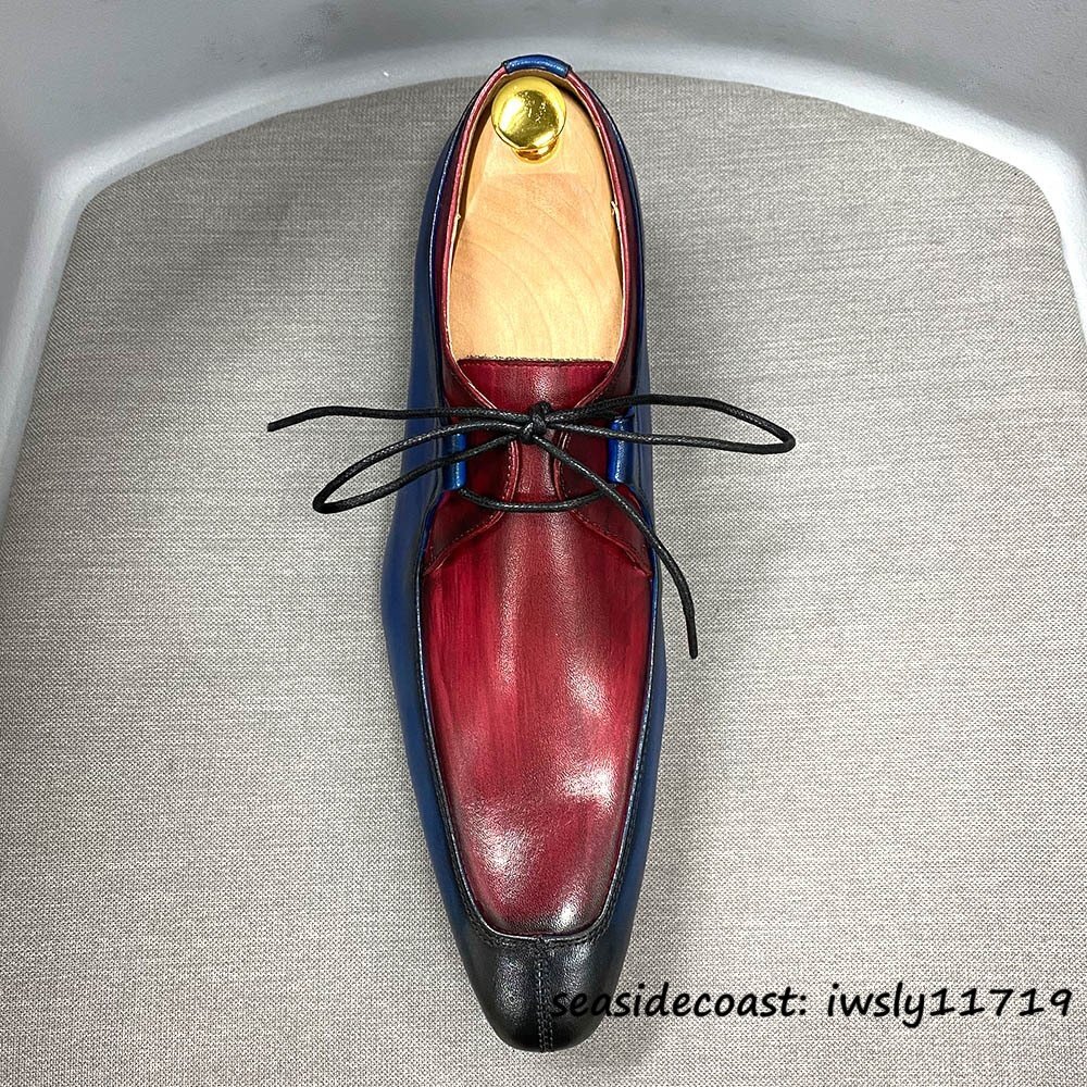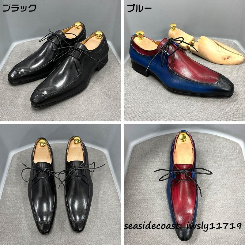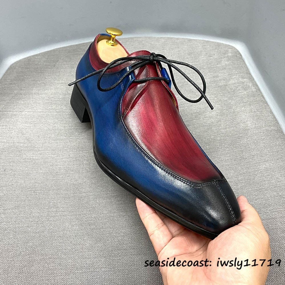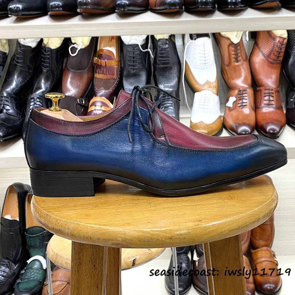 極美品★レザーシューズ メンズ ツートンカラー 本革 ビジネスシューズ 職人手作り 革靴 牛革 紳士靴 レースアップ 個性 ブルー 24.5cm