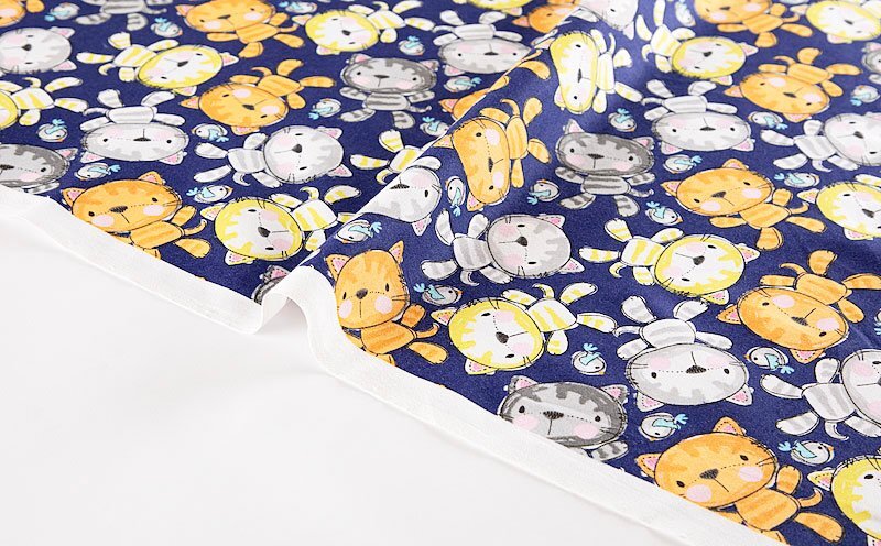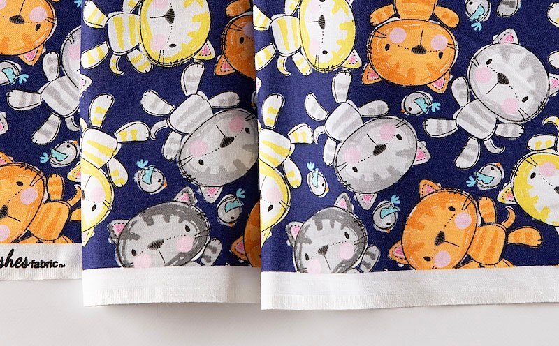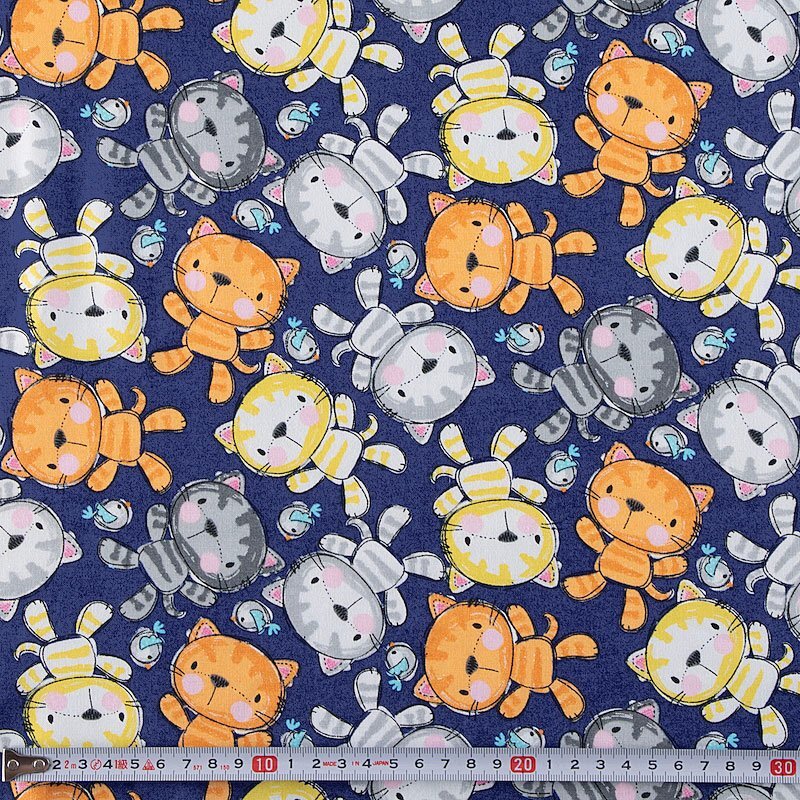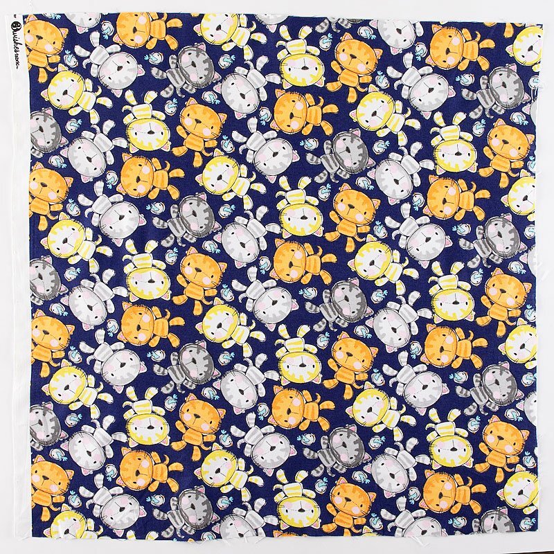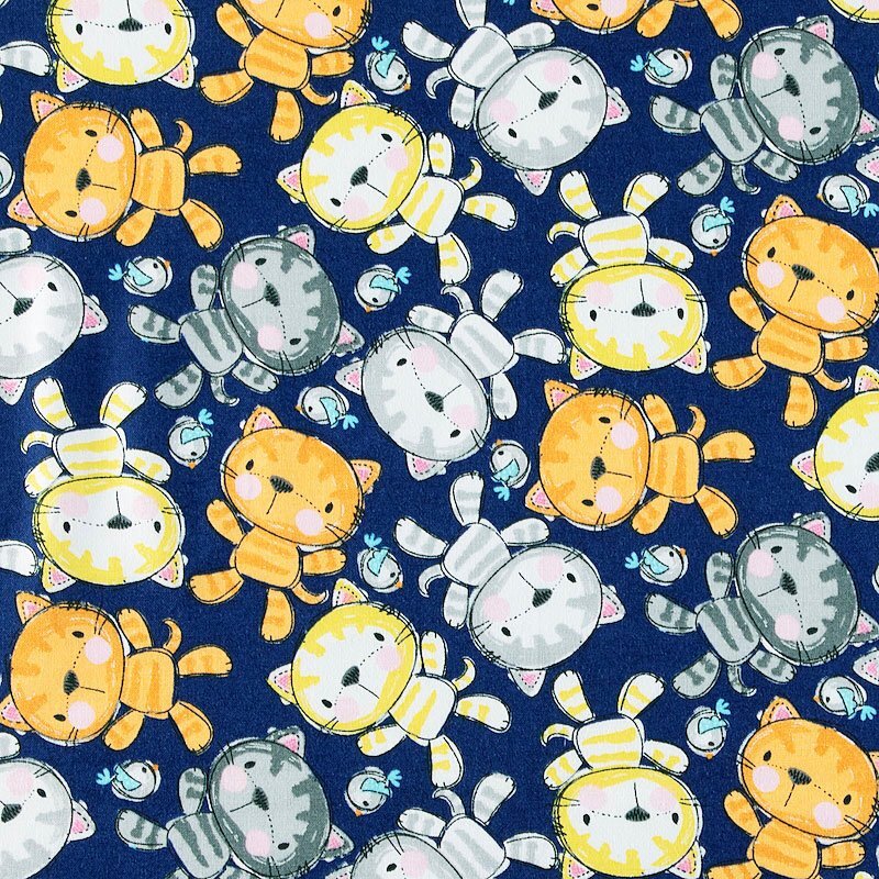 可愛い布製ぬいぐるみのネコと小鳥が生地全体に散らばっています。