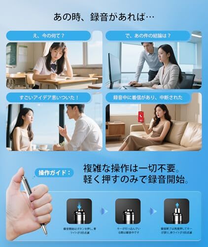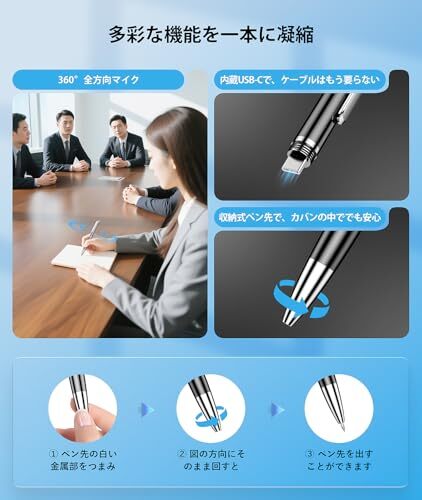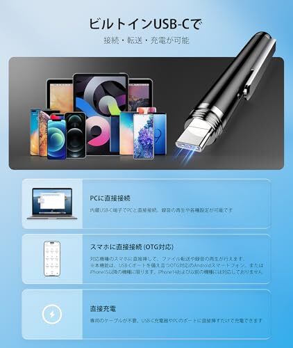 【多機能&充実の付属品】 録音機能に加え、筆記機能、USB外部ストレージ、MP3プレーヤーとしても使用可能。底部を時計回りに回すとペン先が出て、そのまま筆記できます。付属品は本体、Type-C - USB-A変換ケーブル、3.5mmイヤホン及びイヤホンコントローラー、替えペン芯、日本語取扱説明書。すぐにお使いいただけます。