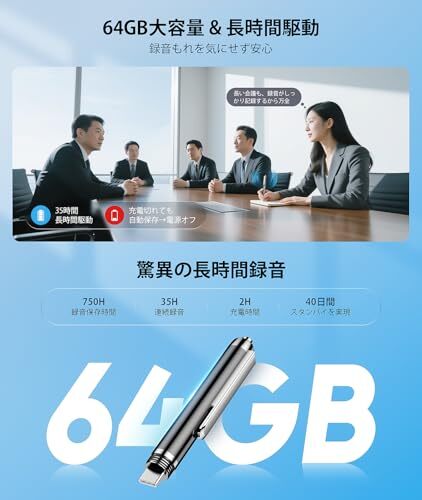 【64GB大容量メモリ&長時間駆動バッテリー】 録音機内蔵の64GB大容量ストレージは、標準設定で約750時間、32Kbpsビットレート時は約4,000時間の録音を保存可能。保存容量不足で録音中断の心配がありません。連続録音は最大35時間を実現。充電時間は約2時間で、バッテリー切れ時は自動保存機能付き。スマートフォンやパソコンのType-Cポートから直接充電できます。