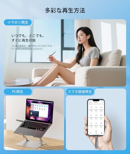 【多彩な再生方法とMP3プレーヤー機能】 Type-Cポート経由でパソコンやスマートフォンに接続し、録音ファイルの再生・管理・削除が可能。付属のイヤホンでも手軽に再生できます。録音したWAVファイルの再生に加え、MP3ファイルの再生も対応。ルートディレクトリにMP3を保存し、再生モードで再生ボタンを長押しするとMP3モードに切り替わり、通勤時や休憩時間に音楽プレーヤーとしてお楽しみいただけます。