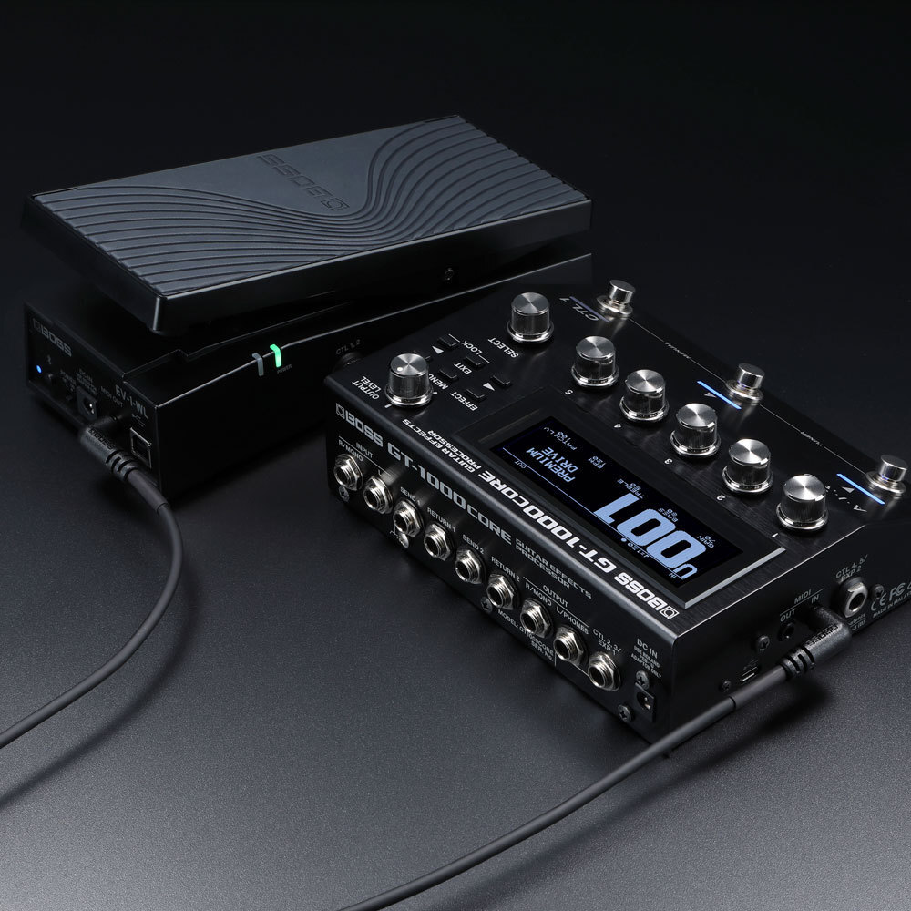 フラッグシップモデルのGT-1000をポータブルなサイズに凝縮したGT-1000COREは高品位なサウンドだけでなく、MIDI制御にも優れています。あらゆるパラメーターのMIDI制御はもちろん、一つの動作で複数の設定を切り替えることが可能です。EV-1-WLをBCCケーブルにて有線MIDI接続することにより、ペダルつま先のON/OFFスイッチによるボリューム/ワウの切替え、さらにはEV-1-WLにフットスイッチを接続し、ディレイのタップテンポ入力として使用するなど、表現の幅が広がります。