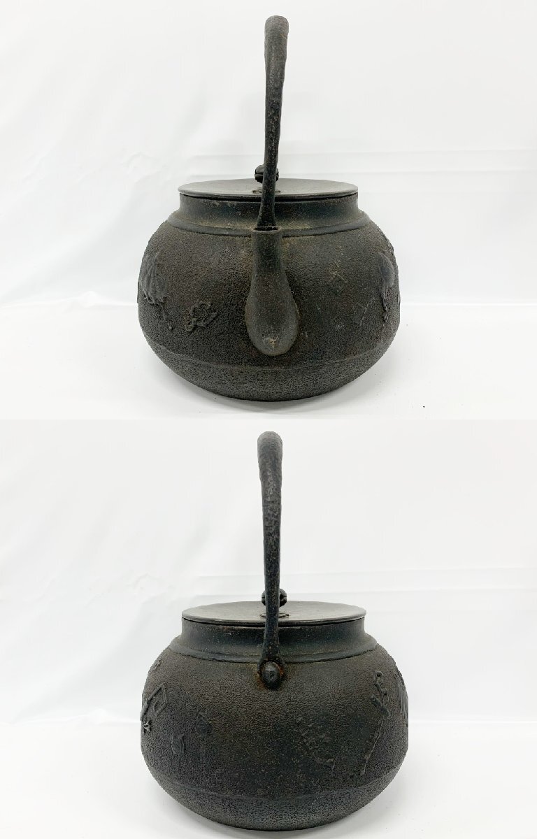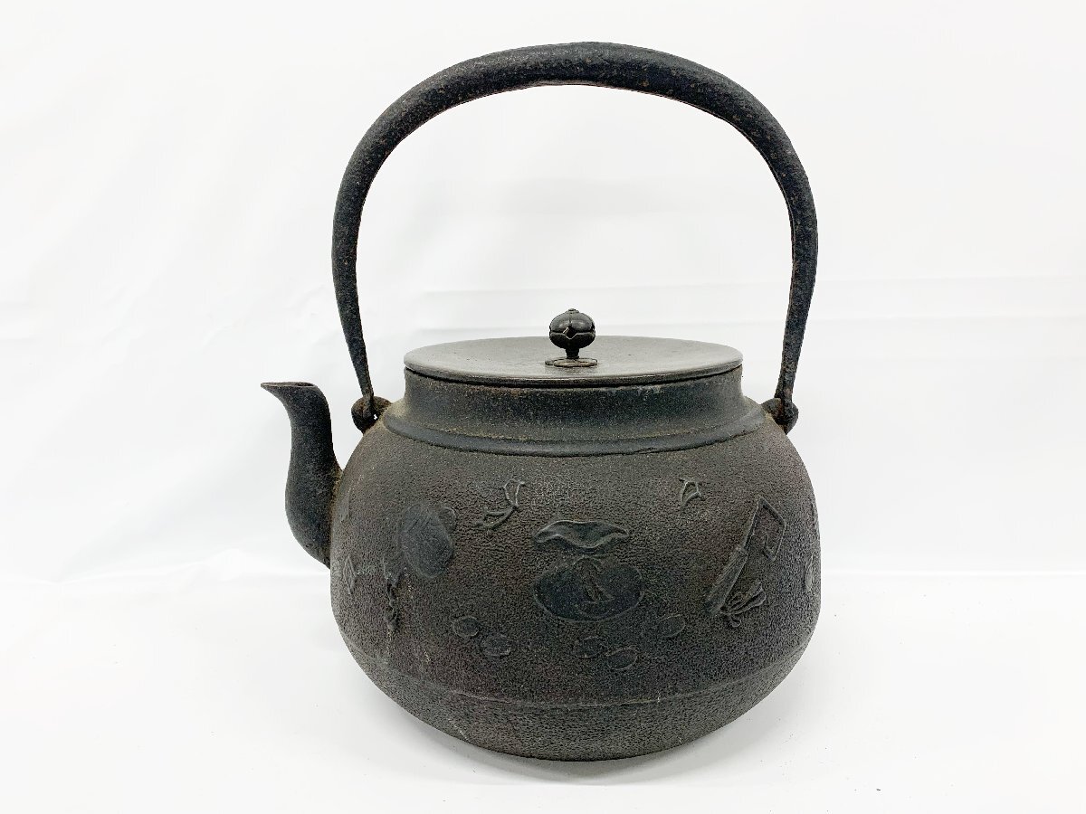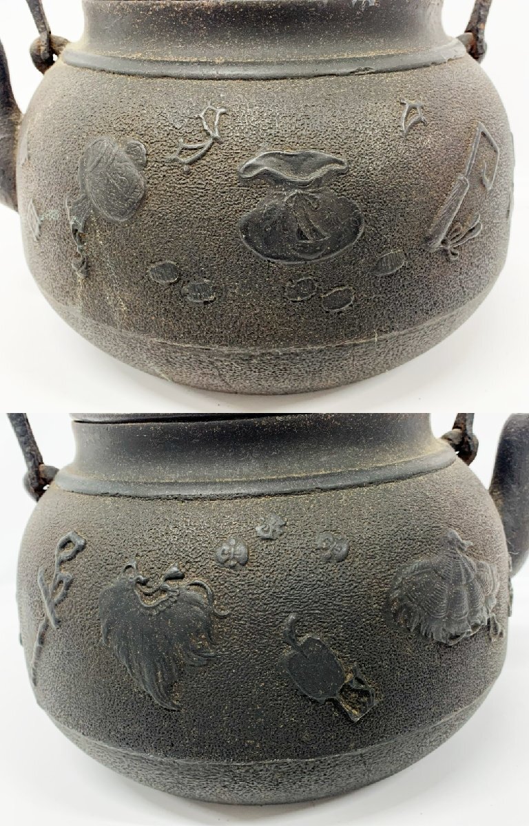 鉄瓶 盛上宝尽くし紋 透梅摘み 総重量 約3271g 大型 湯沸 茶道具 煎茶道具 時代物 骨董品 古美術 K2173N.