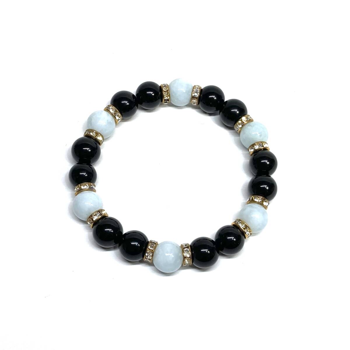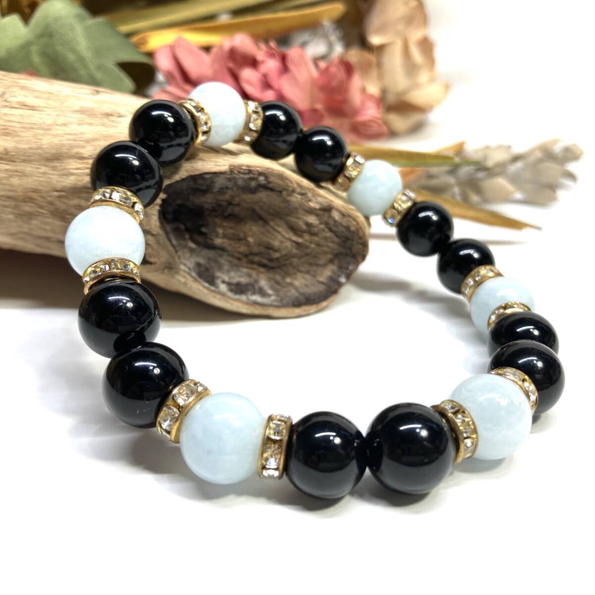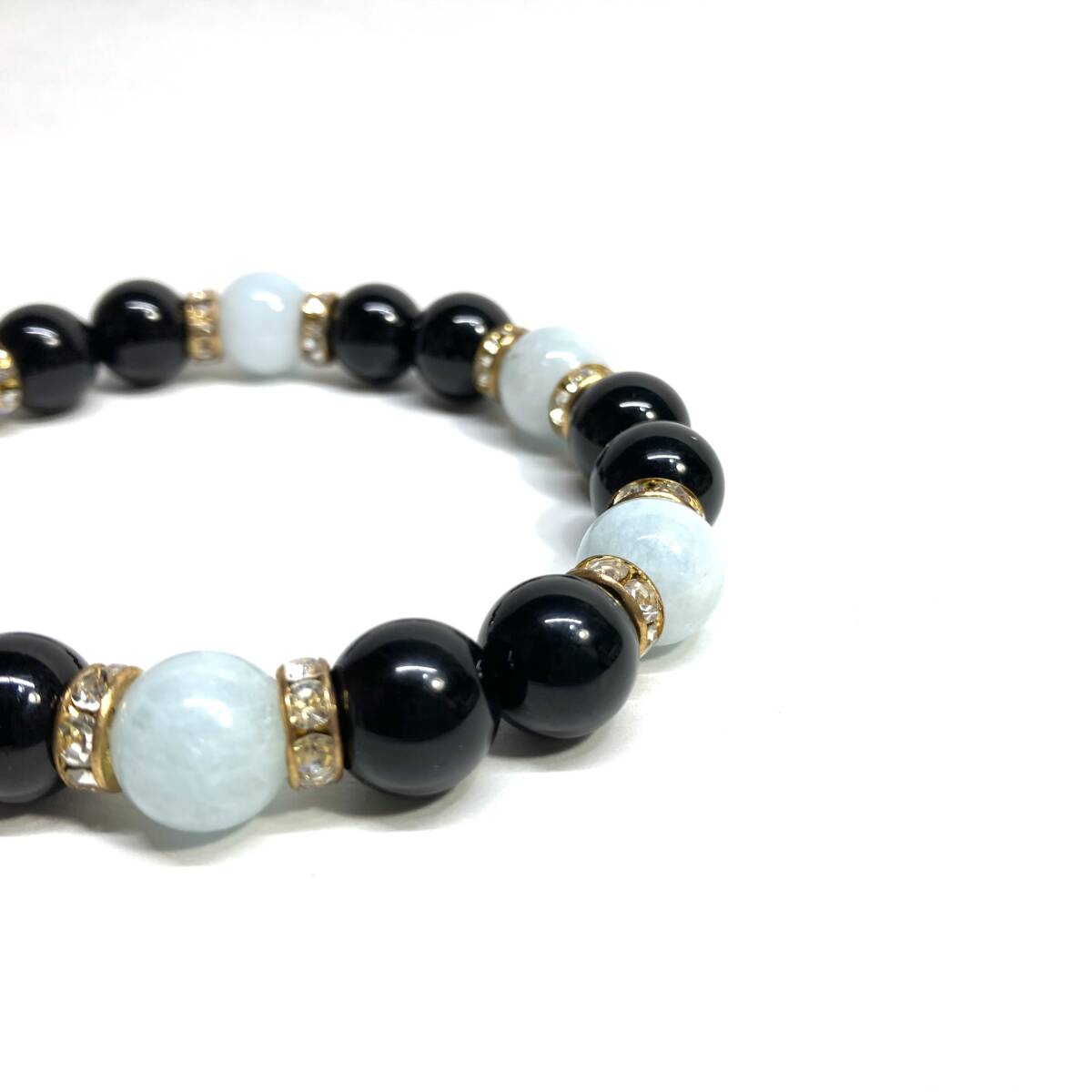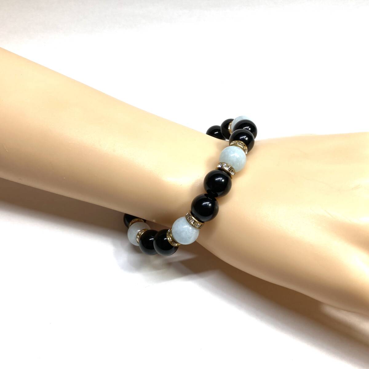こちらは、モリオンとアクアマリンを組み合わせたパワーストーンブレスレットです。間にはロンデルを挟み高級感あるデザインに仕上げております。石大きさは腕にも馴染みやすいように10mm玉で内径約18cm(伸可能)です。(サイズ変更の場合は取引ナビにてご連絡をお願いします。) 数に限りがございますので気になる方はお早めにどうぞ。