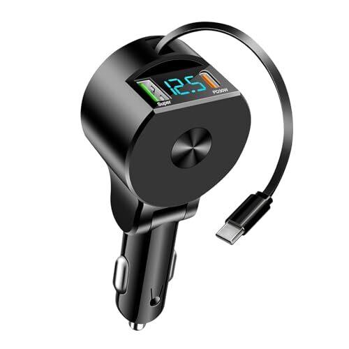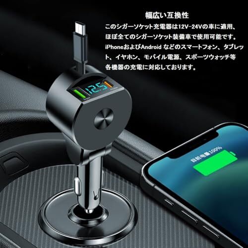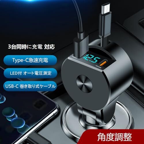 【3台同時に充電】シガーソケット USB-Aポート+ USB-Cポート+1 USB-C 巻取り式ケーブル、3台のデバイスを同時に充電でき。出張、自走、家族・グループ・団体旅行など、さまざまなシーンで活用できます。※ 3台同時に充電する場合は、総合出力が下がることをご了承ください。