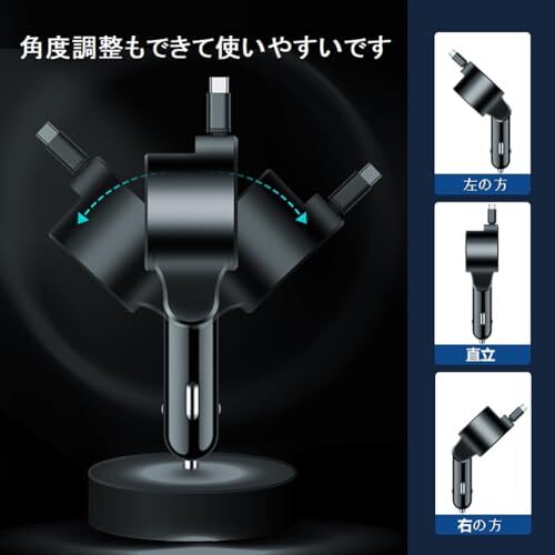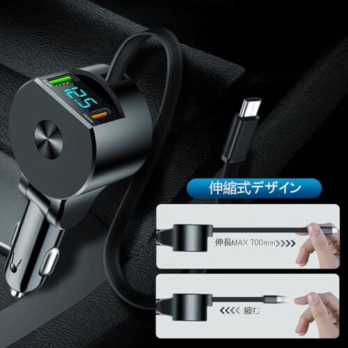 【保存が容易カーチャージャー】巻取り式ケーブルは絡まることなく、車の散らかりにサヨナラ、3cmから70㎝まで簡単に伸ばせ、前・後座席両方の方とも快適に充電できます。シガーライターソケットヘッドは180度回転させることができる。簡単に隠すことができ、場所を取りません。ケーブルを伸ばし過ぎないこと!