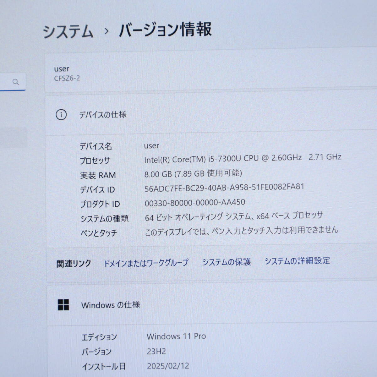 ★完動品 高性能7世代i5!SSD256GB メモリ8GB★CF-SZ6 Core i5-7300U Webカメラ Win11 MS Office2019 H&B ノートパソコン★P92058