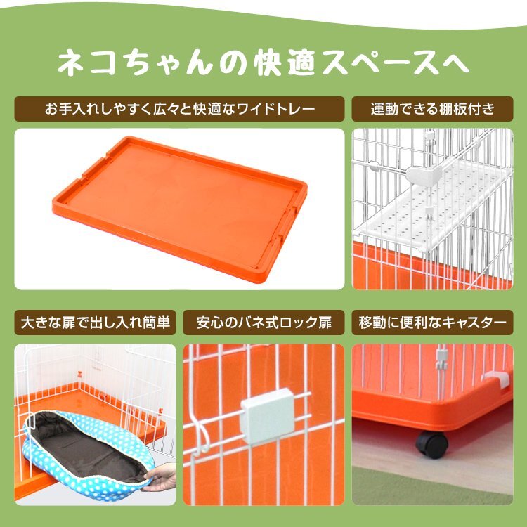 ネコちゃんにおすすめ! 横幅の広いタイプ&高さのある2段タイプのケージです。 互い違いに棚板が付いているので、ネコちゃんが楽しく遊ぶことができます♪ 最下部にトイレが置けるゆとりの大きさです。 全ての段に扉がついているので、ペットや物の出し入れが簡単です。 ケージの高さを変えて2通りの使い方ができます。 組み立て簡単! キャスター付きで移動や掃除もラクラク♪ 【商品仕様】 カラー:ホワイト 耐荷重:中間トレー:体重8kg以下まで ※耐荷重は測定値であり、保障値ではございません。 重さ:(約)11kg サイズ:外寸:(約)幅90×奥行き62×高さ120cm(キャスター含) 内寸:(約)幅84×奥行き53×高さ112cm 棚板トレー:(約)幅17.8×奥行き54.4cm 入口サイズ:(約)幅38×高さ43cm 素材:スチール、PVC、ポリプロピレン 【注意事項】 ・組み立て式(未完成品)です。 ・ペットの予期せぬ行動から発生したケガや事故・破損に対する保障は致しかねます。 ・表示されている耐荷重以上では絶対に使用しないでください。商品が破損したり、ケガをする恐れがあります。 ・生後間もない幼猫にご使用の場合、フェンスの隙間から頭や体が出る恐れがありますので注意してください。 ・写真と実物は多少異なる場合がございます。あらかじめご了承下さい。 ・商品は、モニターによって色合いが異なって見える場合があります。 ・仕様・デザインは改良のため予告なく変更することがあります。 |