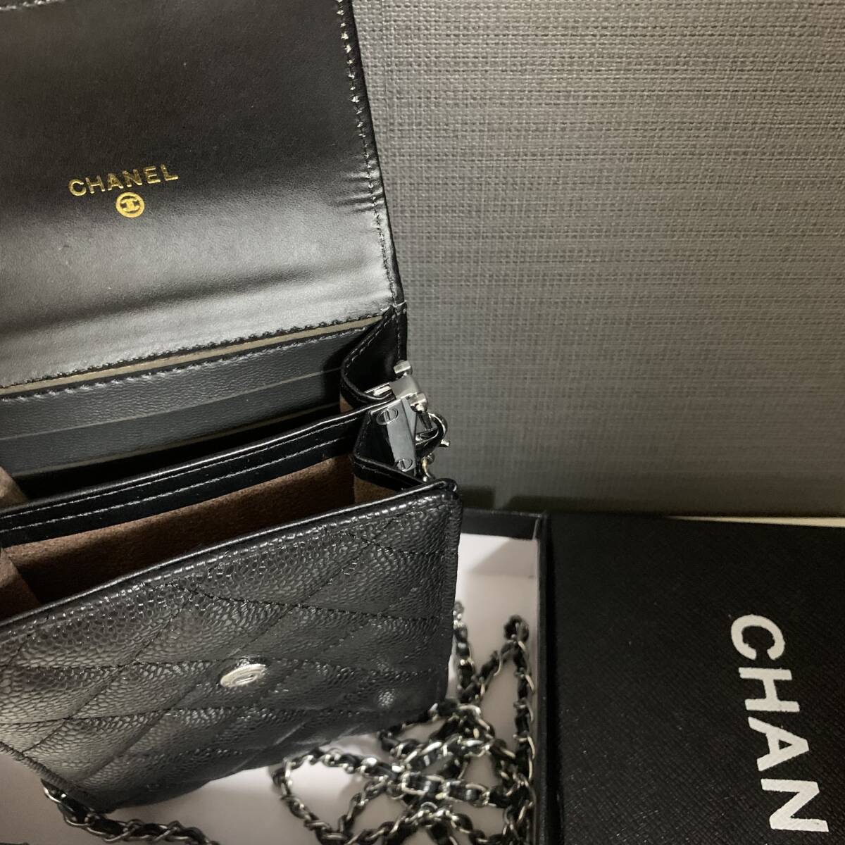 中に仕切りあり。チェーンは取り外し可能です。