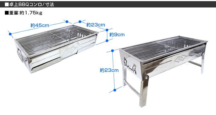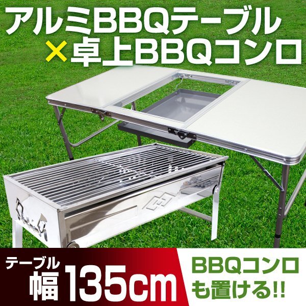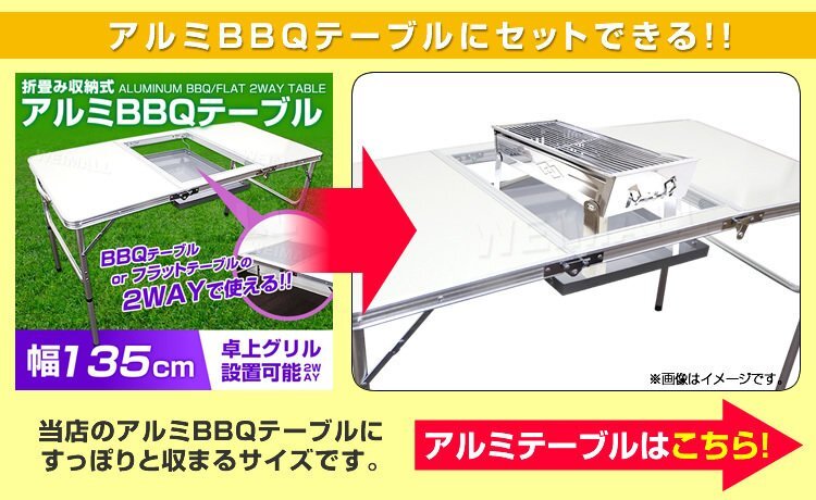 | 【アウトドアテーブル】 バーベキューコンロが設置できるアウトドアテーブルです。 軽量アルミ製+取っ手付きで、アウトドアやBBQにぴったり!! 組み立てはとっても簡単! 開いてロックするだけの簡単設置タイプなので女性一人でも気軽に組立てができます。 バーベキューコンロを設置する場合は、天板のプレートを裏返し、フックに取り付けるだけで超簡単です。 もちろんフタを閉じればフラットテーブルとしてお使いいただけます♪ 高さは「ハイスタイル」「ロースタイル」の2段階調節。 お好みや用途に合わせて使い分けることができる嬉しい仕様♪ 【バーベキューコンロ】 たった2ステップで簡単組立! 卓上で楽しめる、コンパクトBBQコンロです! 本体部は丈夫なステンレス製でサビや汚れに強く、拭き取り掃除もラクラクです。 レジャーテーブルに座ったスタイルで、のんびりBBQを楽しみたい方にピッタリ!! 折りたたみ式で持ち運びラクラク! キャンプ、バーベキュー、お花見などにとても便利! 【商品内容】 ●アウトドアテーブル 折りたたみ式 テーブルサイズ(約):幅135×奥行65×高さ40cm/70cm ※高さ2段階調節 バーベキュー部サイズ:幅40×奥行54cm 収納サイズ(約):幅65×奥行10.5×高さ45cm 耐荷重(約):テーブル/25kg、コンロ部分/10kg 重量(約):6.7kg 材質:アルミ、MDF(耐熱・耐水加工)、ポリエステル、スチール ●バーベキューコンロ 本体サイズ(約):45×23×23cm 収納サイズ(約):45×23×9cm 重量(約):1.8kg 素材:ステンレススチール 他 【注意事項】 ・必ず屋外で使用してください。室内、テント内、換気の悪い場所では使用しないでください。一酸化中毒、酸欠、火災の恐れがあります。 ・組み立て、後片付けは安全のため手袋をはめて行ってください。 ・海外製品で、簡易梱包での輸入のため風防に擦れや多少の小キズなどがある場合がございますが、商品自体には問題ありませんのでご了承下さい。 ・商品は、モニターによって色合いが異なって見える場合があります。 ・仕様・デザインは改良のため予告なく変更することがあります。 |