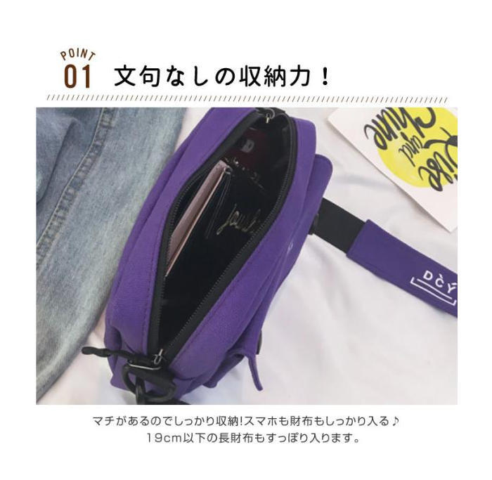 | 商品仕様 | 文句なしの収納力! マチがあるのでしっかり収納!スマホも財布もしっかり入る。 長財布もすっぽり入る。(19cm以下) 外側に大きめのポケット付 仕分けできる嬉しいポケット付。 バッグの中がごちゃつきません。 ポケットは見た目もかわいいボタン式で、荷物も取り出しやすい。 肩紐の調整可能!ユニセックスで使える◎ |
