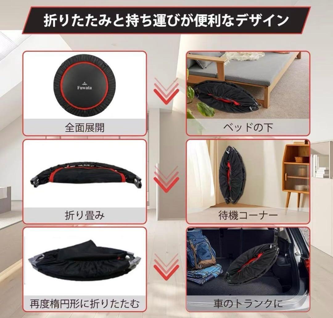 組み立て簡単・折りたたみ式:折りたたみ式トランポリンの組み立て方がわかりやすく、フィットネストランポリン本体を広げて、足、手すりなどの部品を日本語取扱説明書通りにちゃんと取り付ければ、簡単に組立できます。初めての方でも説明書通りにてすぐに組み立てられます。そして、お引越しや収納時にはコンパクトにたたむことができ、収納や移動にもとても便利です。