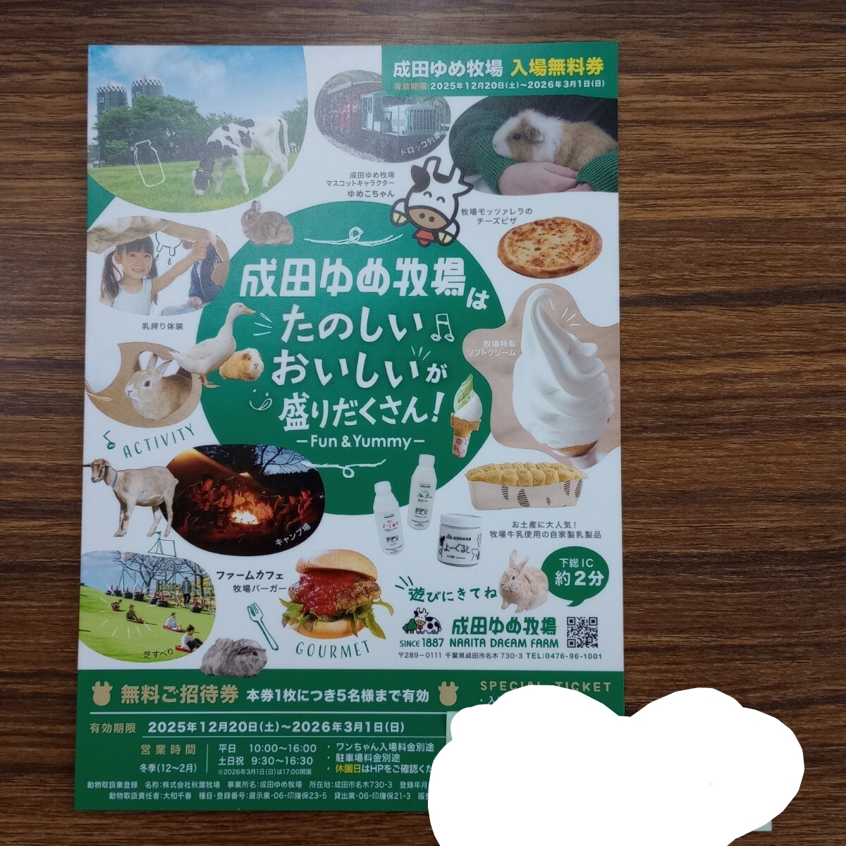 成田ゆめ牧場の5名まで入場できる招待券です。12月20日から3月1日までの期間です。
