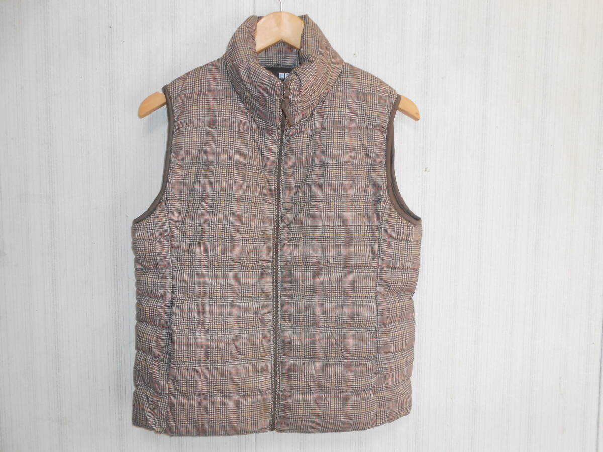 A196美品ユニクロウルトラライトダウンチェック柄ベストブラウンL女性用