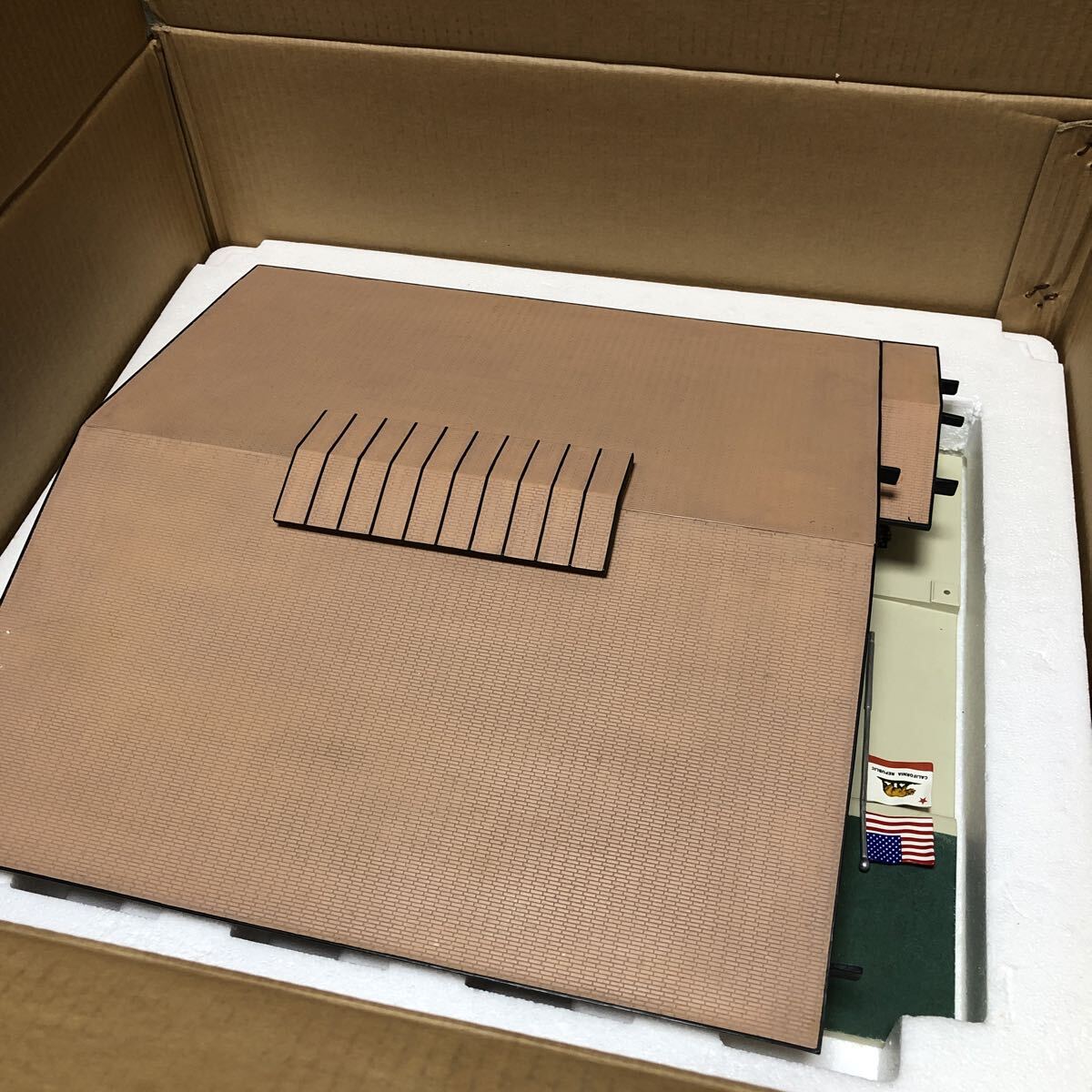 開封品です。少し破損箇所あります。旗の支柱折れてます。ギリギリ中の線?が繋がっているため立てられます。画像7.8枚目の建物の出っ張りが折れてます。修復してある箇所もあります。ほか多少のスレ、色移りがあります。