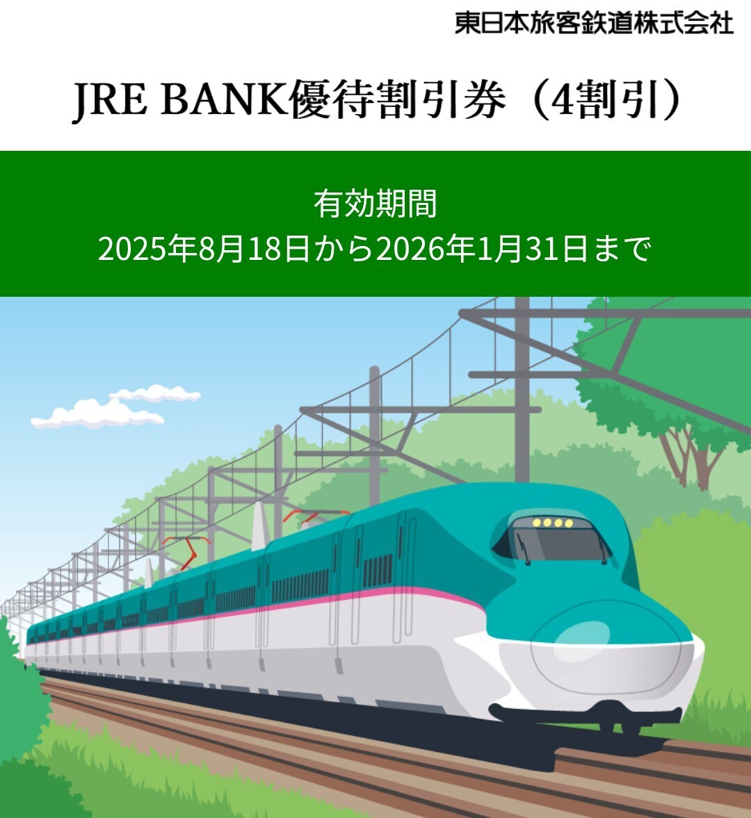 【ご利用方法】 えきねっと(Web)にてお申込みの際、「株主優待/JRE BANK優待割引(片道限定)」にチェックを入れ、画面に記載のご案内に従い、JRE BANK優待割引券番号等をご入力ください。