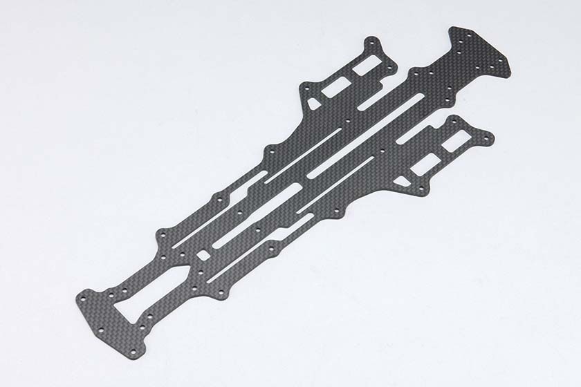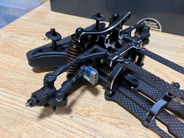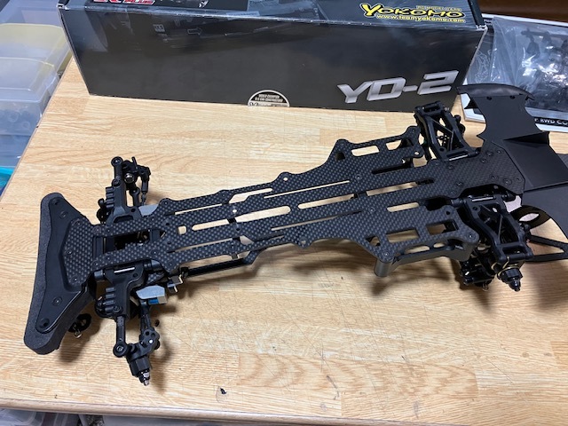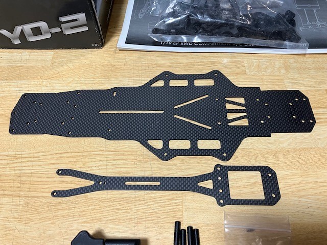 出品物は画像1が全てになります。オプションパーツに取替えた部品と予備部品も付けます。尚、元キットのYD-2Rのカーボンシャーシは、サスアームと当たる所を切取り加工しています。画像6で確認ください。