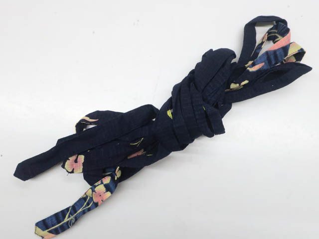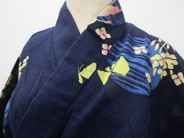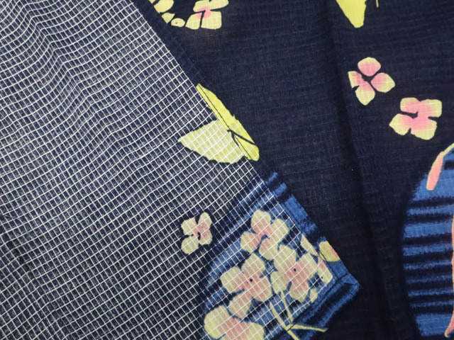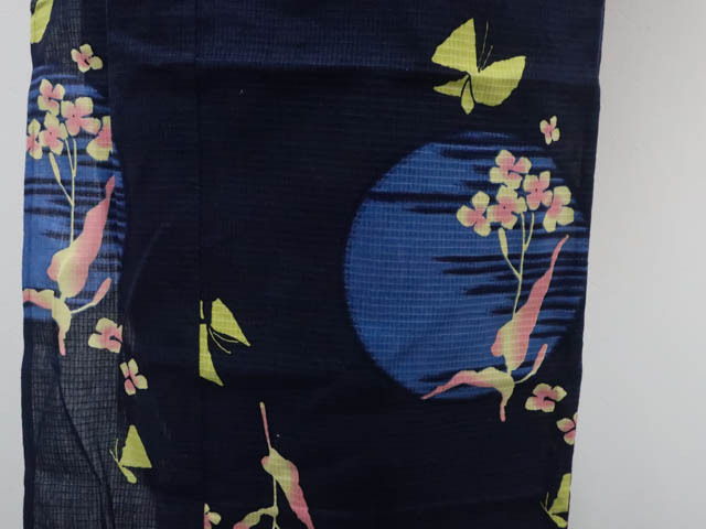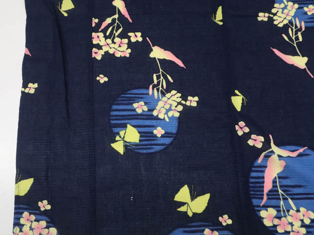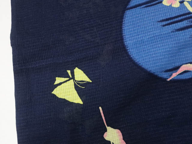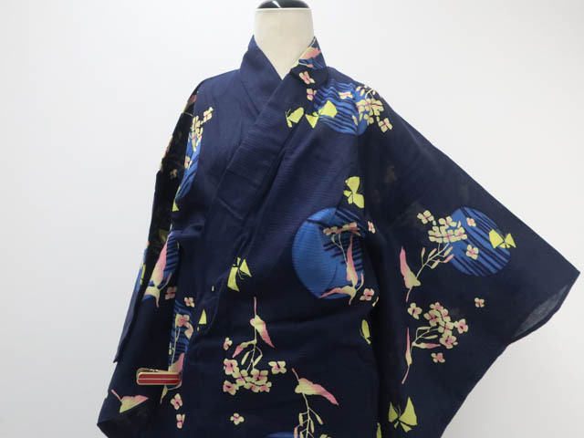 リサイクル商品のため、右前袖にスレ汚れとしわがございますが着用可能なお品です。 腰紐付でございます。 地色は 紺です。 1枚目の画像が近いお色かと思われます。 素材は綿です。 |