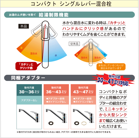 ■ システムキッチン用のワンホール シングルレバー混合栓です。