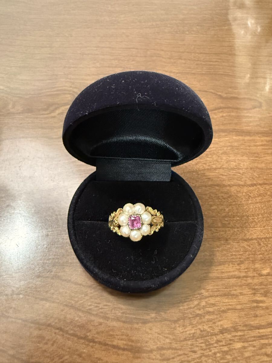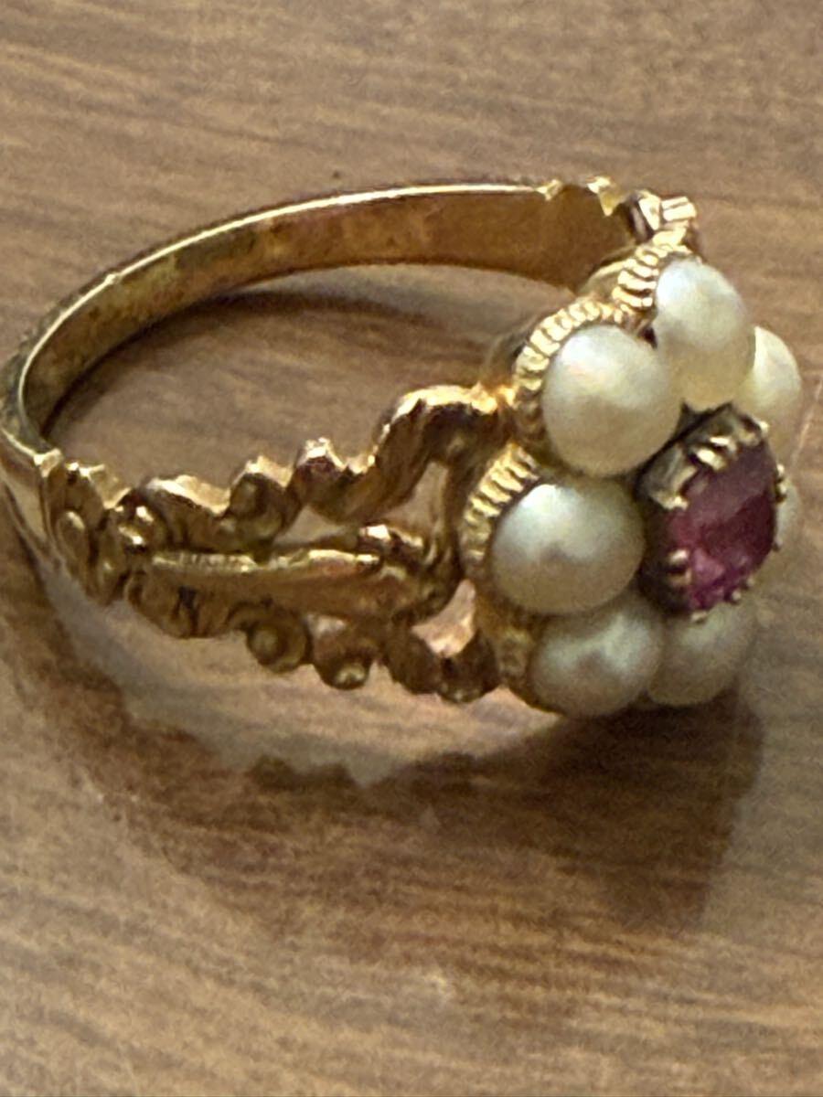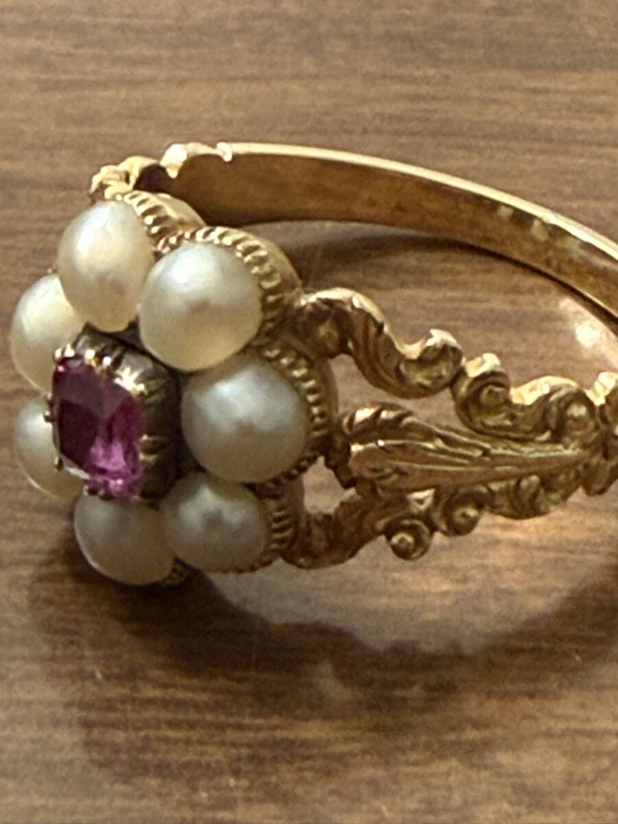 中央にピンクがかったルビー、周囲に上質なパールをあしらったクラスターデザインで、年代物らしい繊細な金細工がとても美しい一点です。