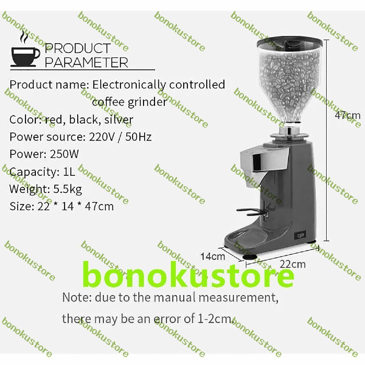 商品の説明 名前: 電気コーヒーグラインダー 電力: 250W 電圧: 220V サイズ: 22x14x47cm 容量: 1.5L ギア位置: 19 ギア調整 名前: 電気コーヒーグラインダー 電力: 250W 電圧: 220V サイズ: 22x14x47cm 容量: 1.5L ギア位置: 19 ギア調整 業務用1Lコーヒー豆グラインダー、25