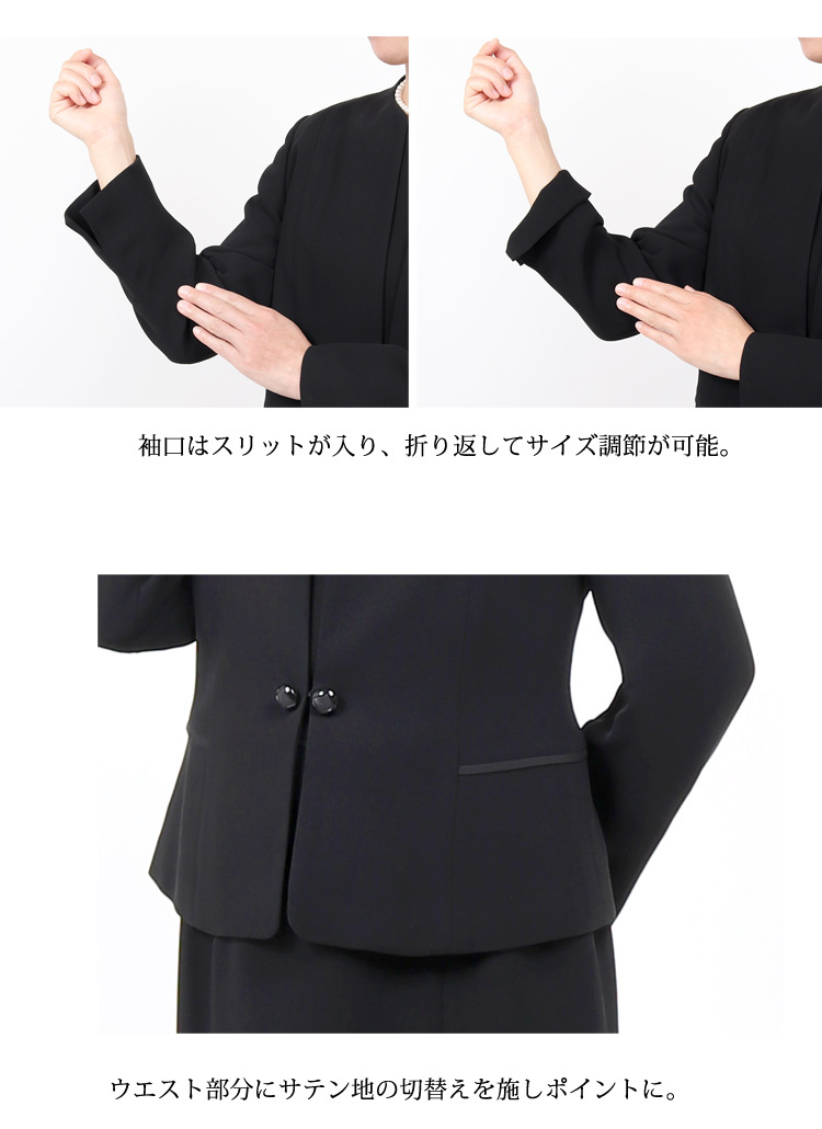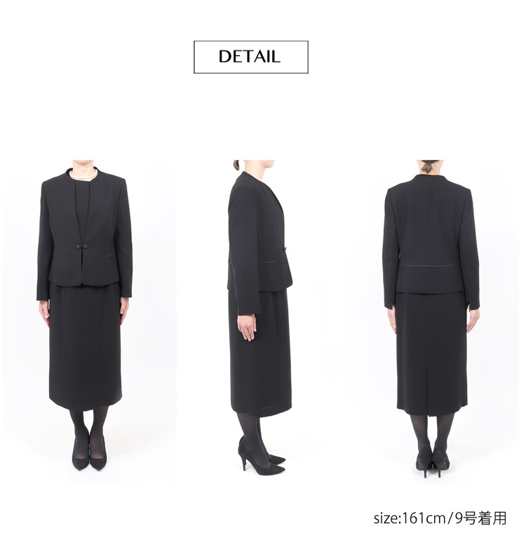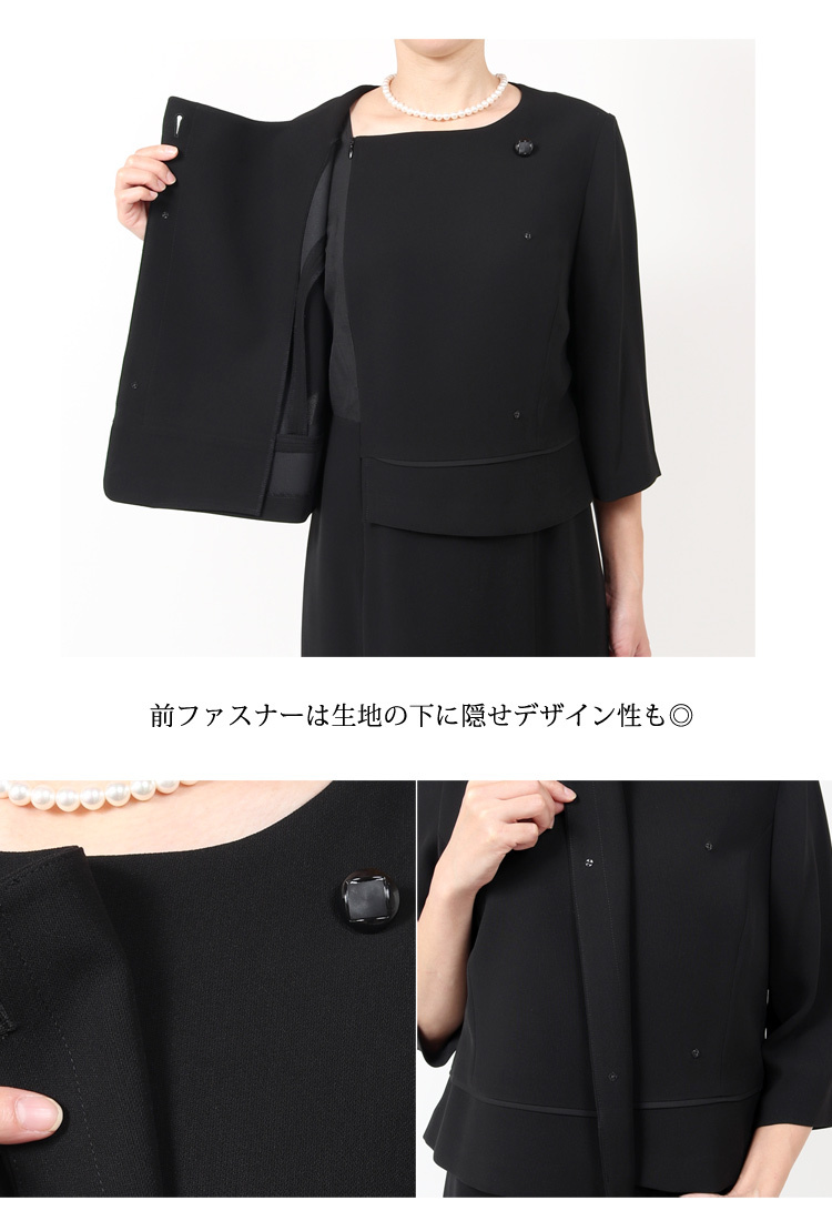 | 洗える ブラックフォーマル 9号サイズ 脱ぎ着が簡単で授乳中のママに人気の前開きブラックフォーマルです。 デザインもスッキリとしたノーカラーで高級感があります。 喪服としてだけでなく、お手持ちのコサージュをつけて、お子様の卒園式や卒業式などのママスタイルとしてもおすすめです。 こちらの商品はご自宅で洗濯が可能です。 ■商品番号 109t111-au ■セット内容 ジャケット・ワンピース ■実寸サイズ ジャケット