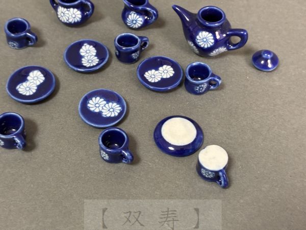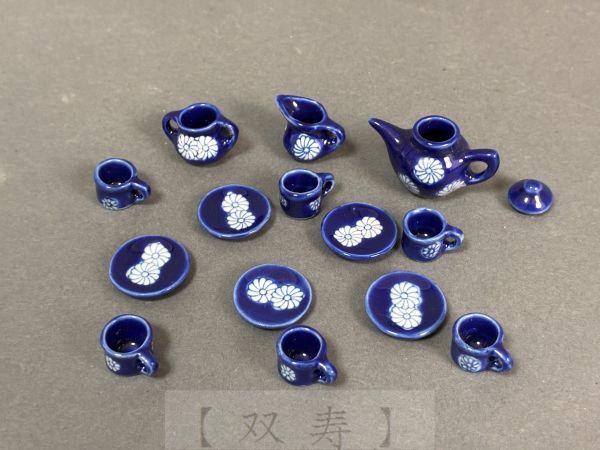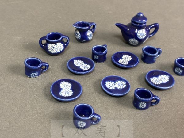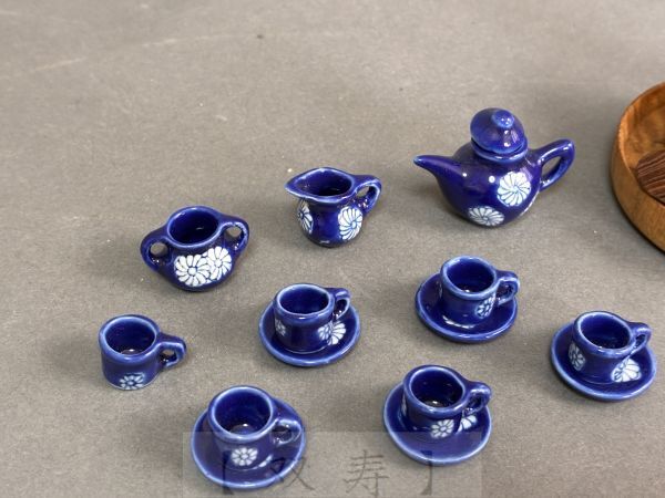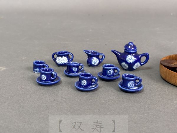 ご覧の通りとても小さな、磁器で作られたコヒーカップのセットで瑠璃色で菊紋のような柄の入ったセットになります。カップは5客セットですがコサー皿が一つ紛失しています。ミルクポットの蓋もありません。煎茶セットは木製クリ抜きのセットになりますが、茶碗が一ッ無くなっています。両セットともヒビ・割れ・欠けはありませんが、細かなスレや汚れなどはあります。