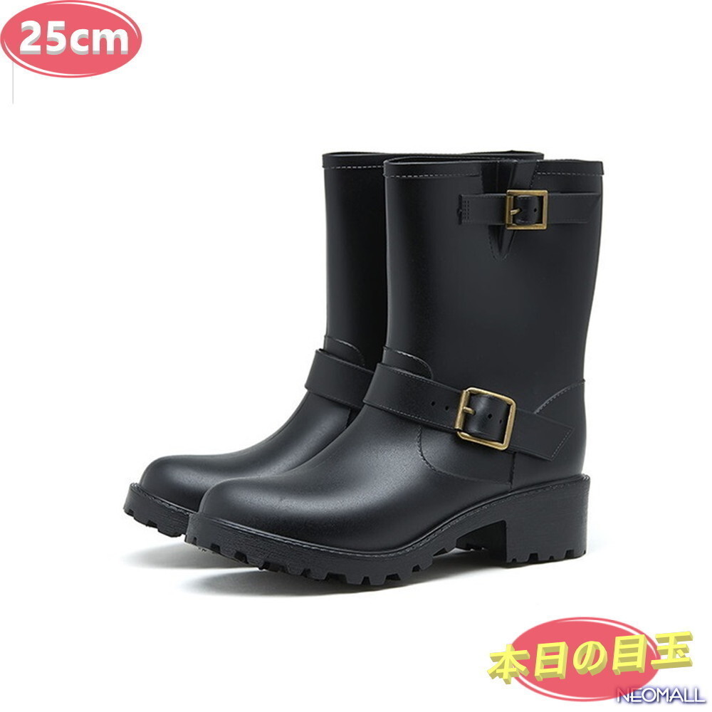 1スタ☆ レディース お洒落な レインブーツ【495】 25.0cm ブラック レインシューズ 雨靴 梅雨対策 防滑 防水 雨 雪 晴れ兼用