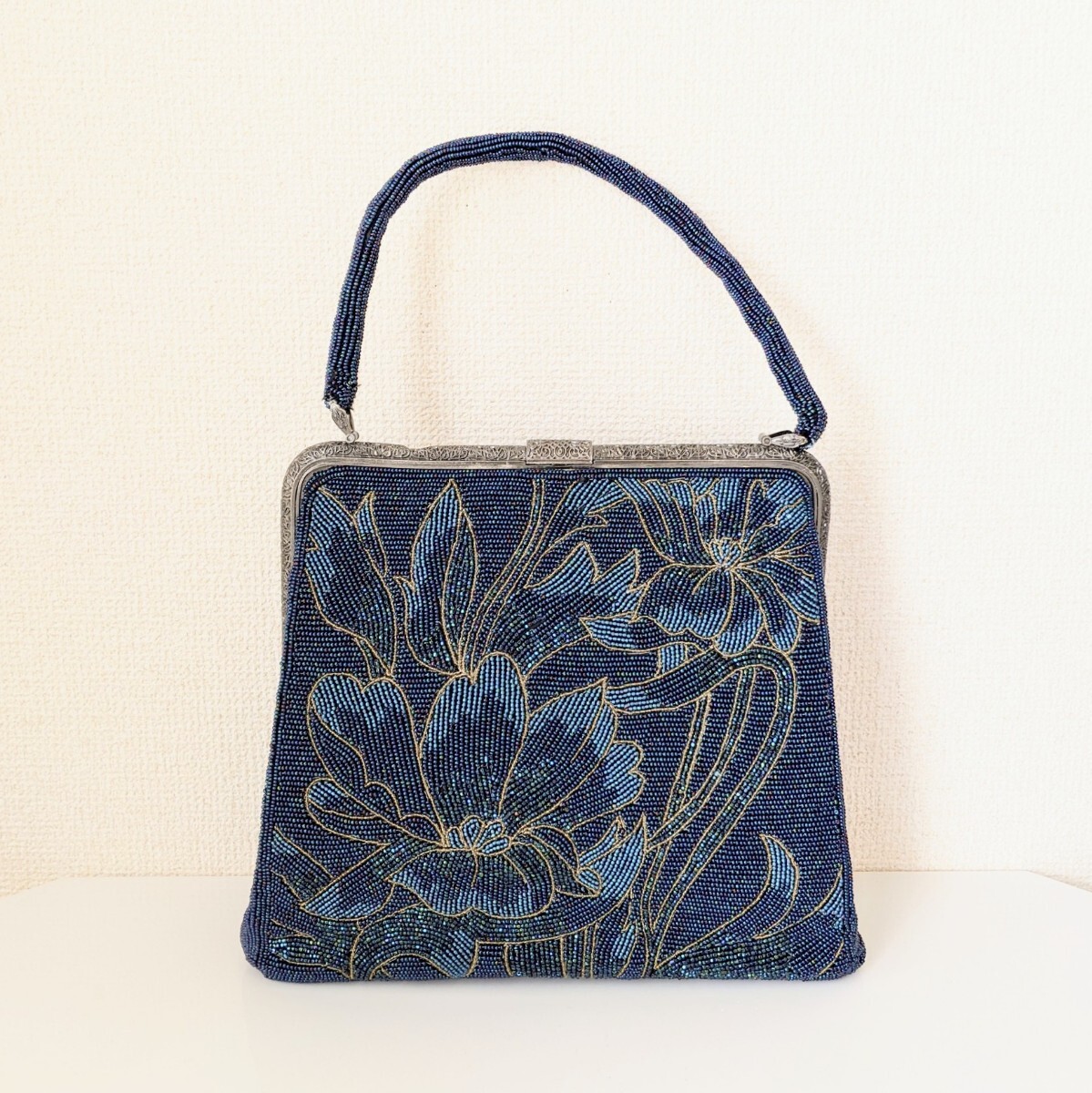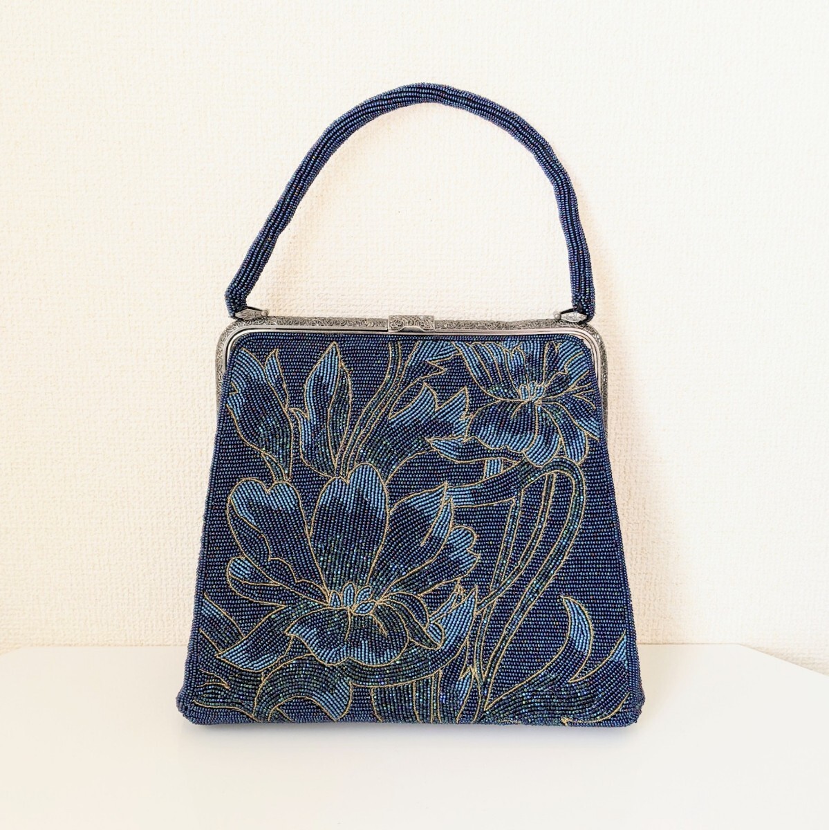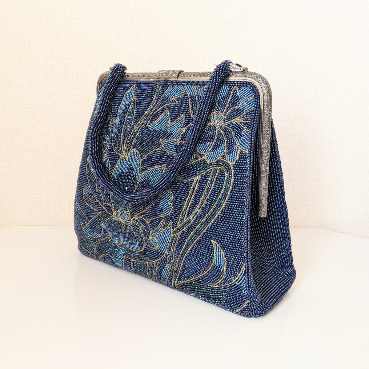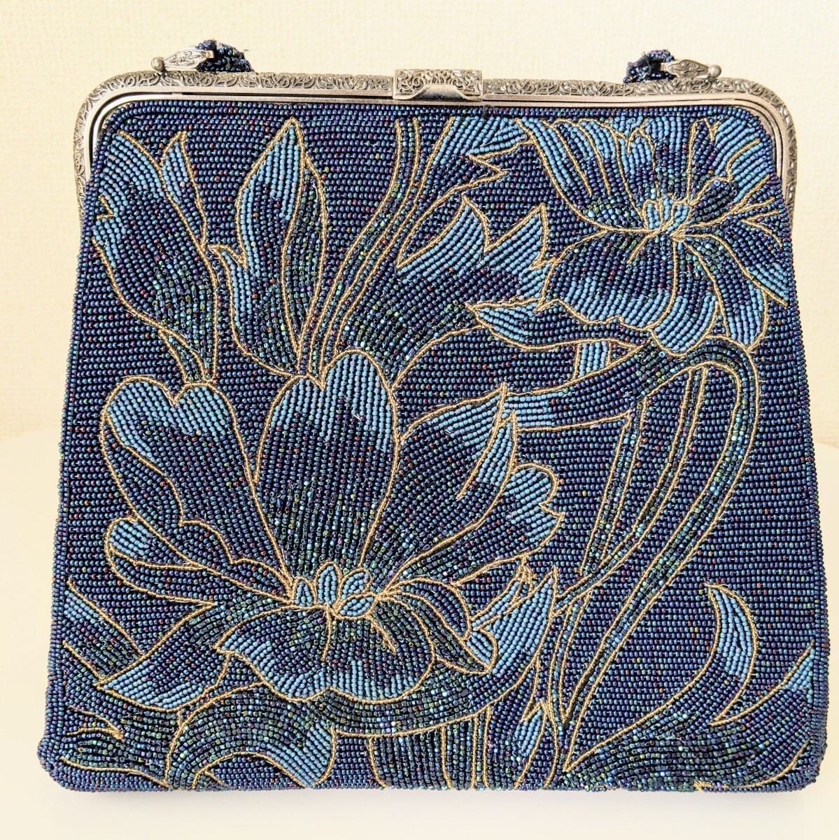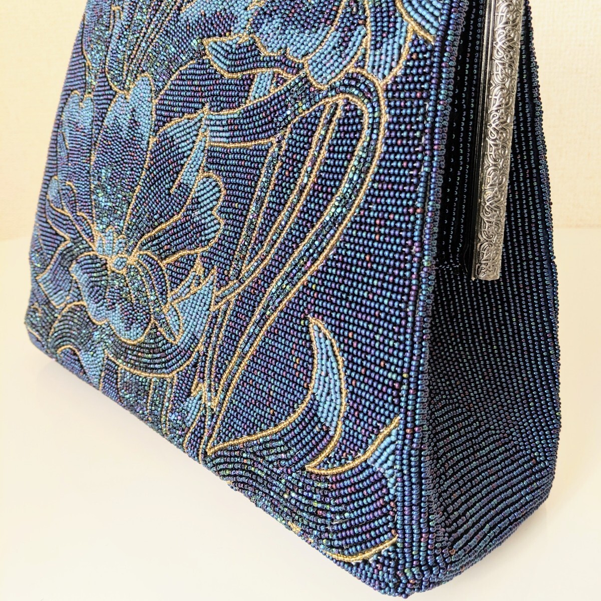 青系ビーズの表情豊かな花柄が金彩のような縁取りで表現されたゴージャスな組み合わせのビーズバッグです。