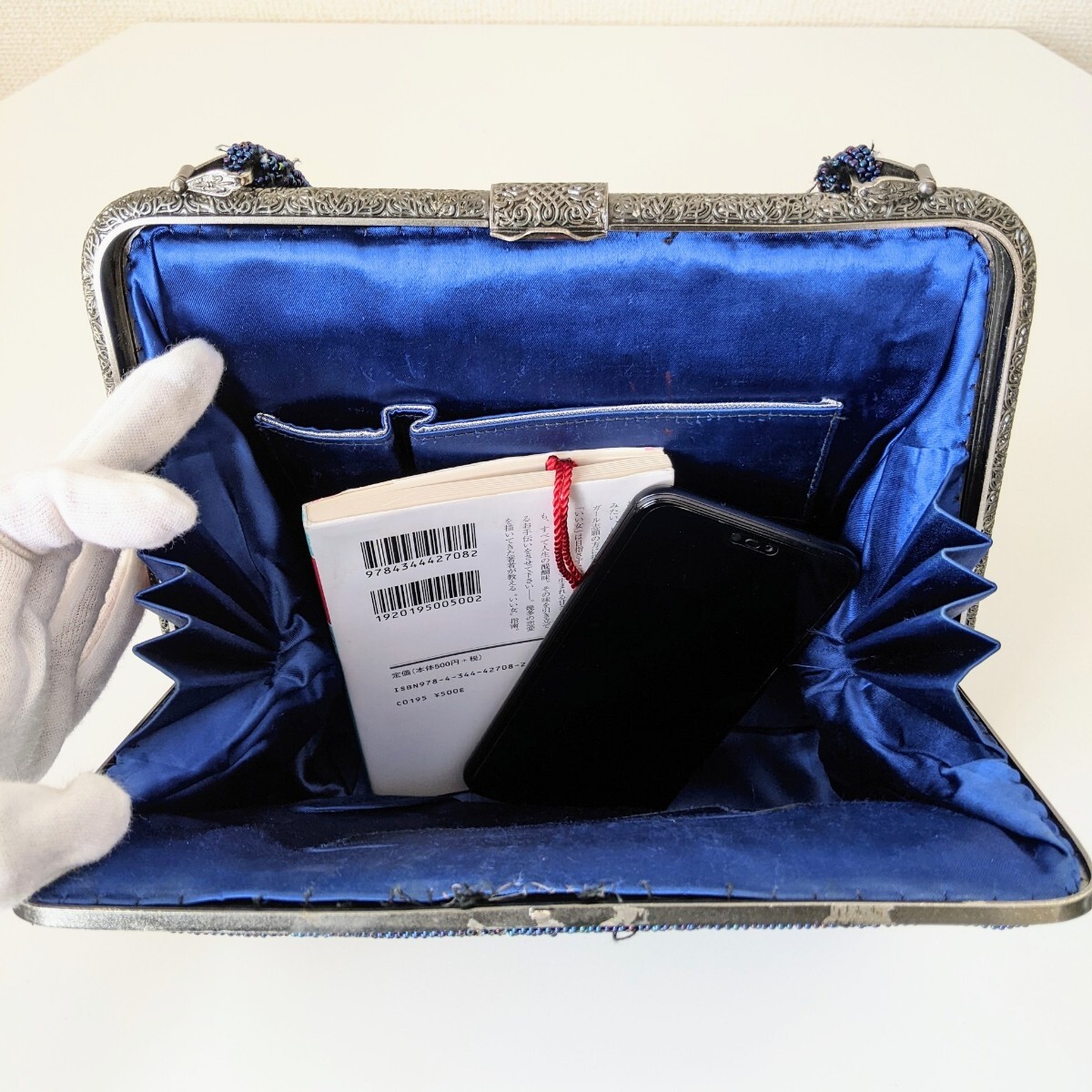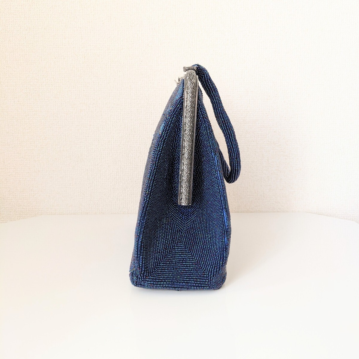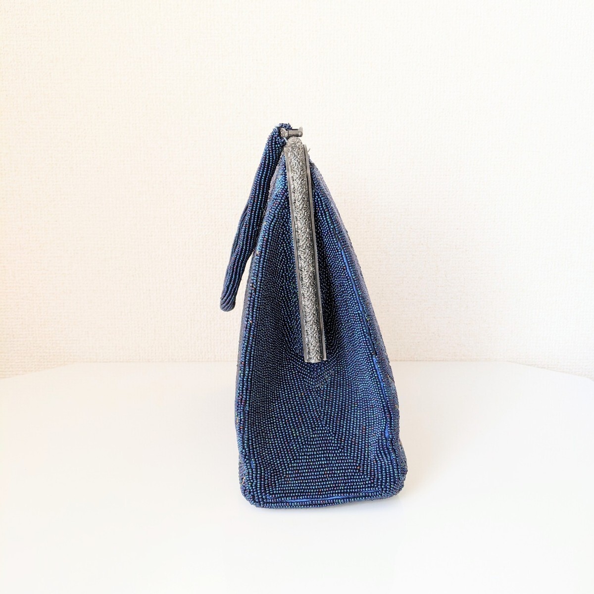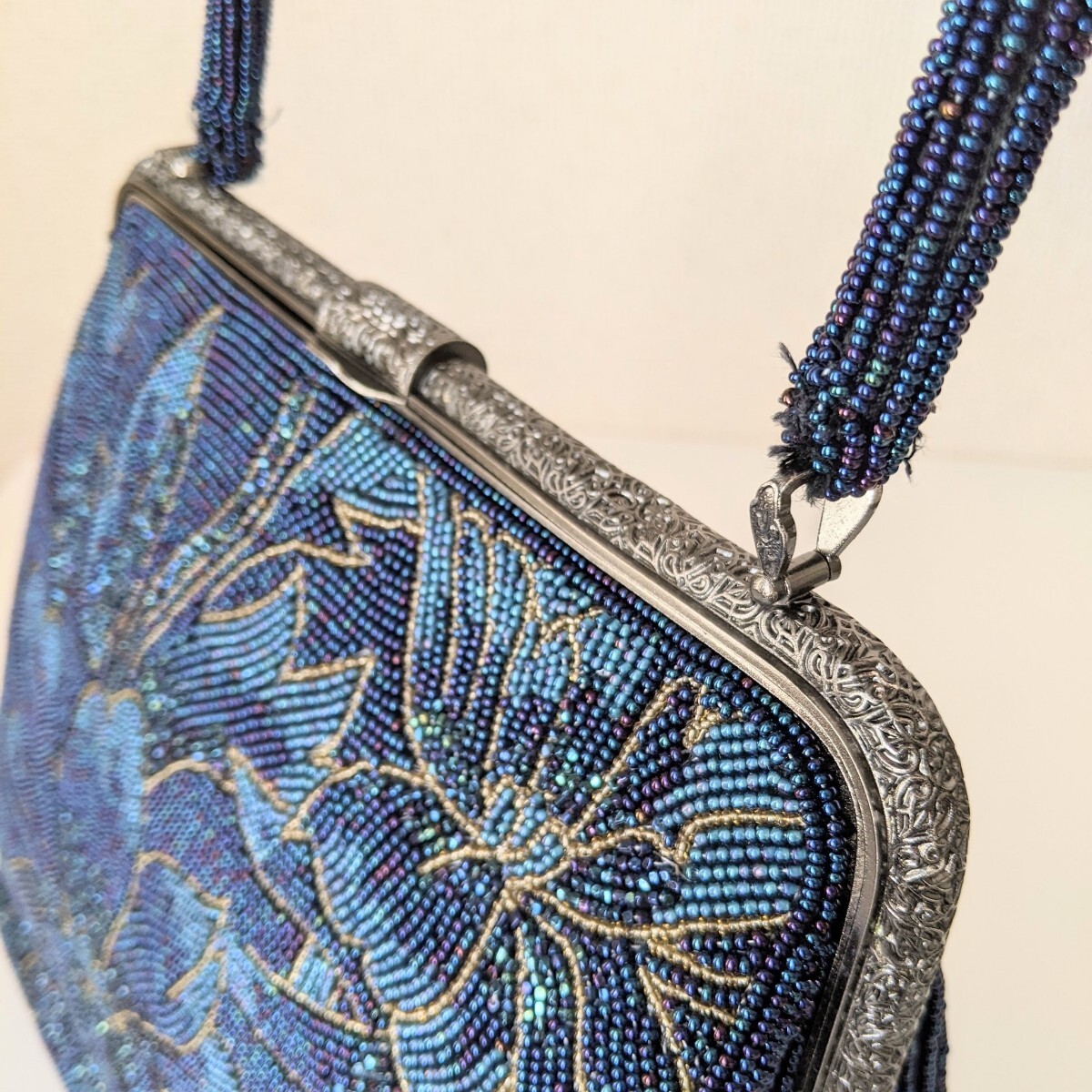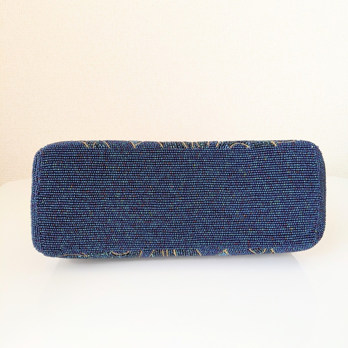 青系ビーズの表情豊かな花柄が金彩のような縁取りで表現されたゴージャスな組み合わせのビーズバッグです。