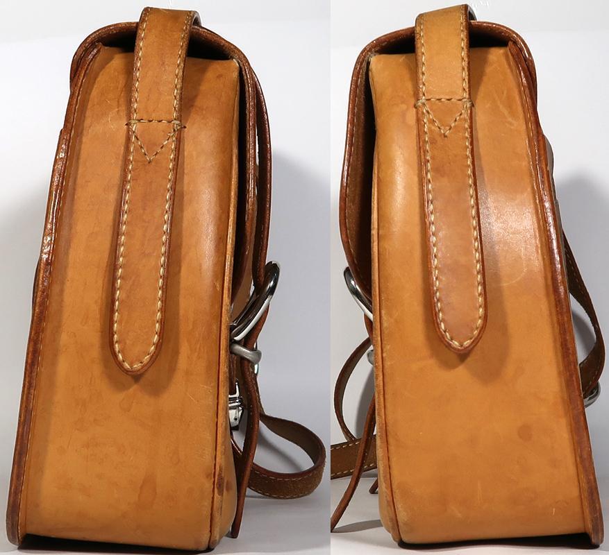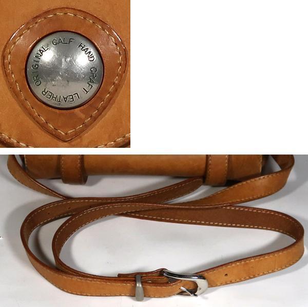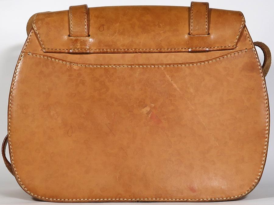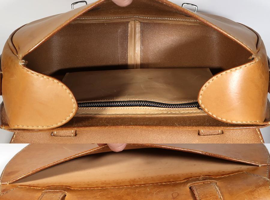 国内の革工房に注文して創ってもらった物だと、もと所有者は言っておりました。厚みのあるしっかりした作りのショルダーバックです。使用品ですしそれなりに年数は経っておりますのでしみ、汚れや擦れあります。部分的には擦り傷もあります。ひどい傷はないです。バックの内側も同様の状態ですが、ひどい傷や目立つような汚れはないです。ポケットはメインのポケットの他に内側にファスナーポケットとバックの背面にサイドポケットがあります。バックのサイズはW35xH27xD10cmくらいです。ショルダーストラップは2段階で調整可能です。ロングサイズだと126~136cmくらいに穴が5個あります。ショートサイズだと100~105cmくらいに穴が3個あります。ストラップの幅は2.3cmくらいです