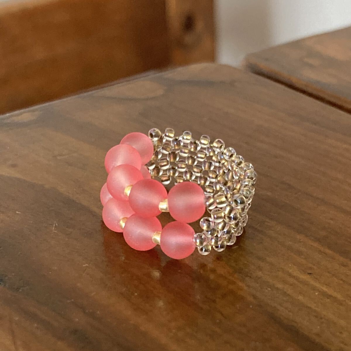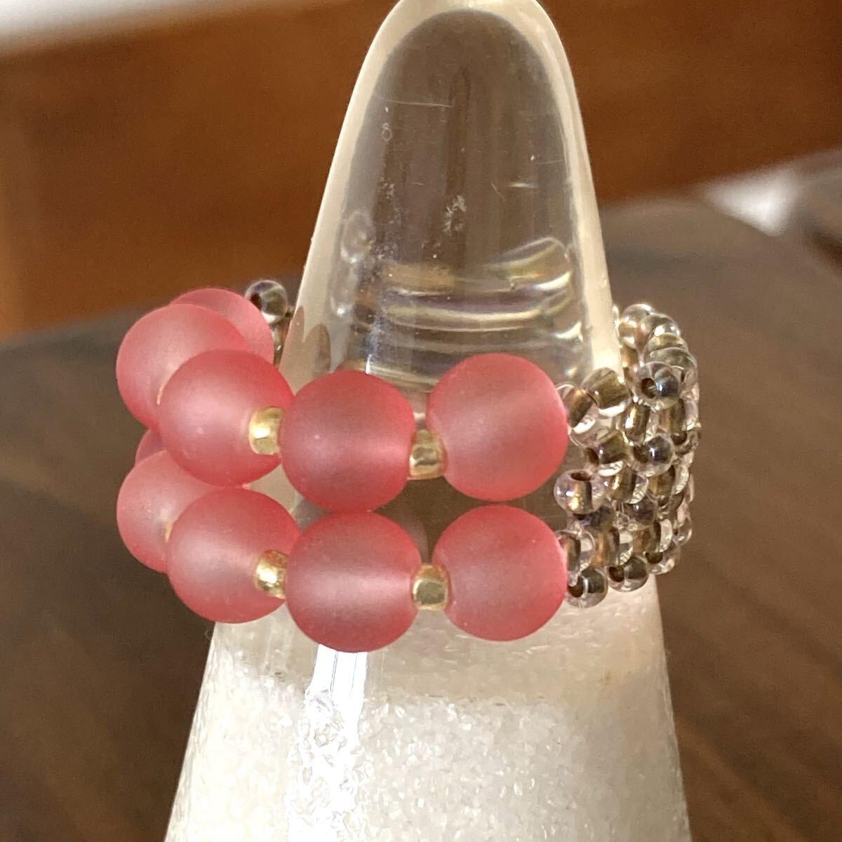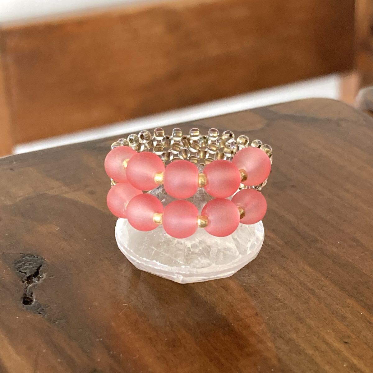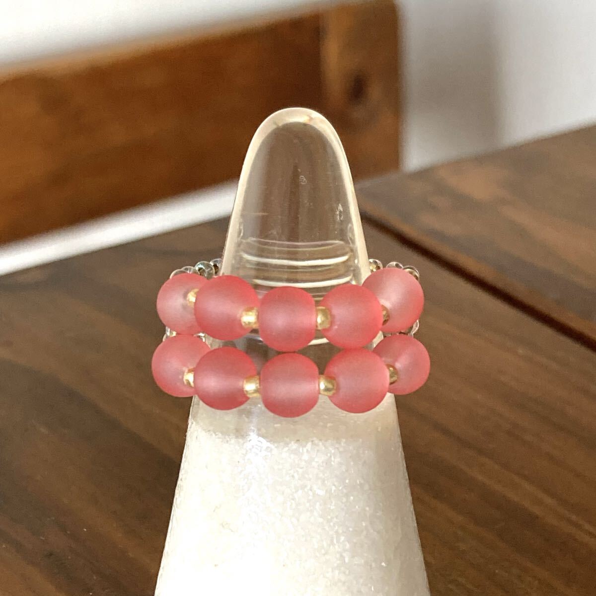 ピンクのフロストラウンドビーズを2段に並べたデザインののリングです♪