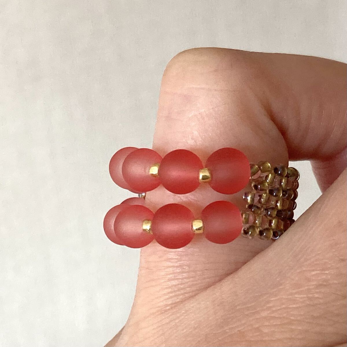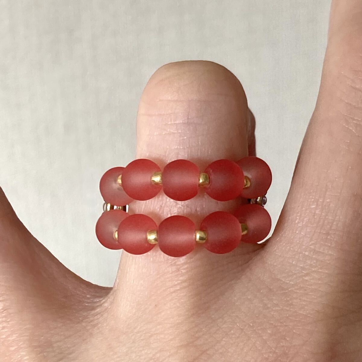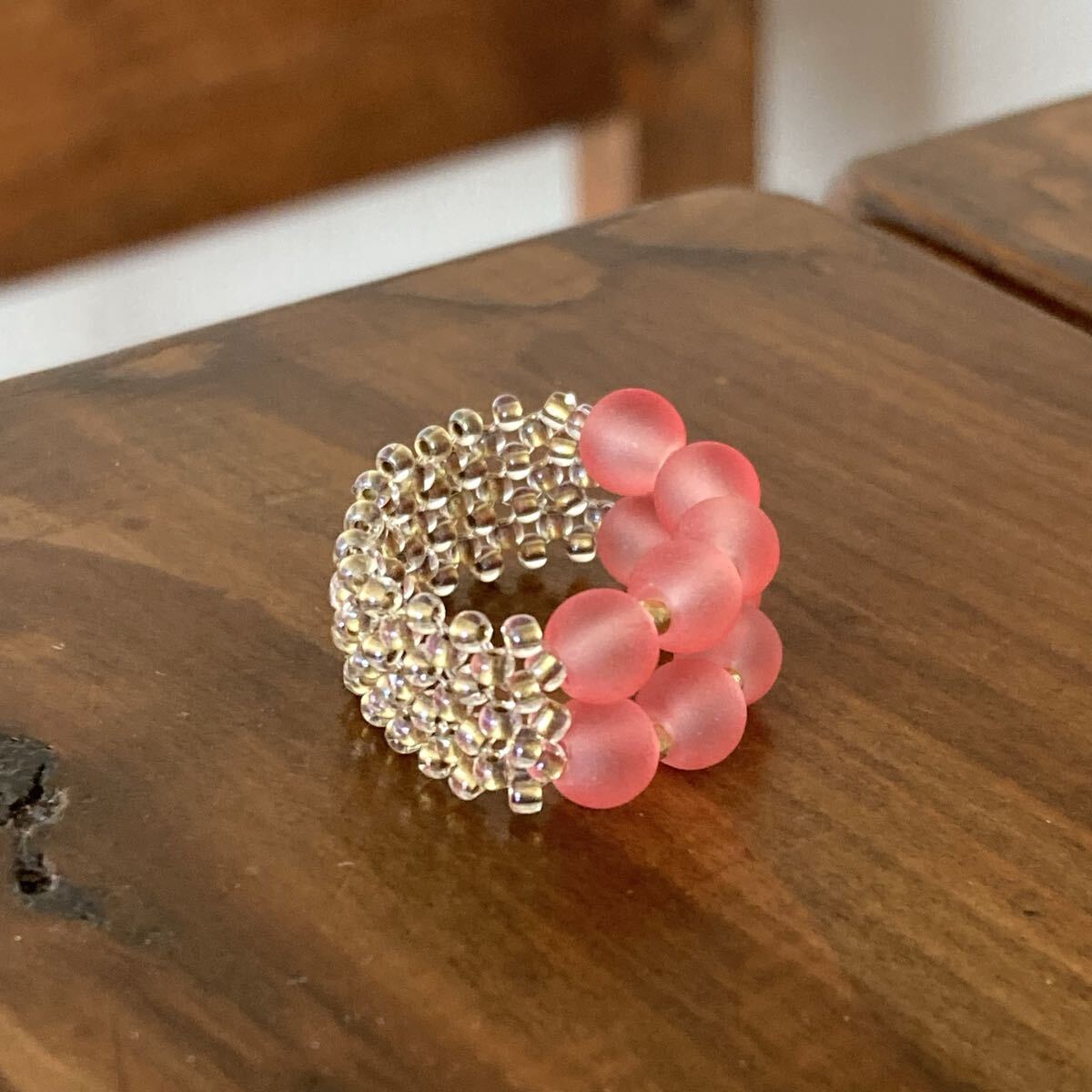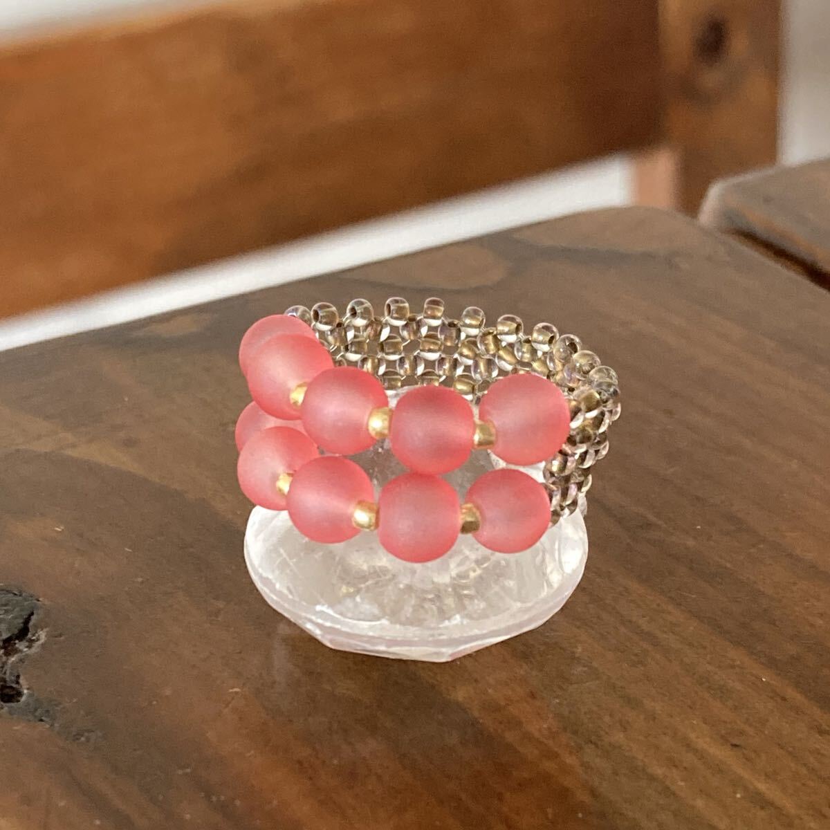 ピンクのフロストラウンドビーズを2段に並べたデザインののリングです♪