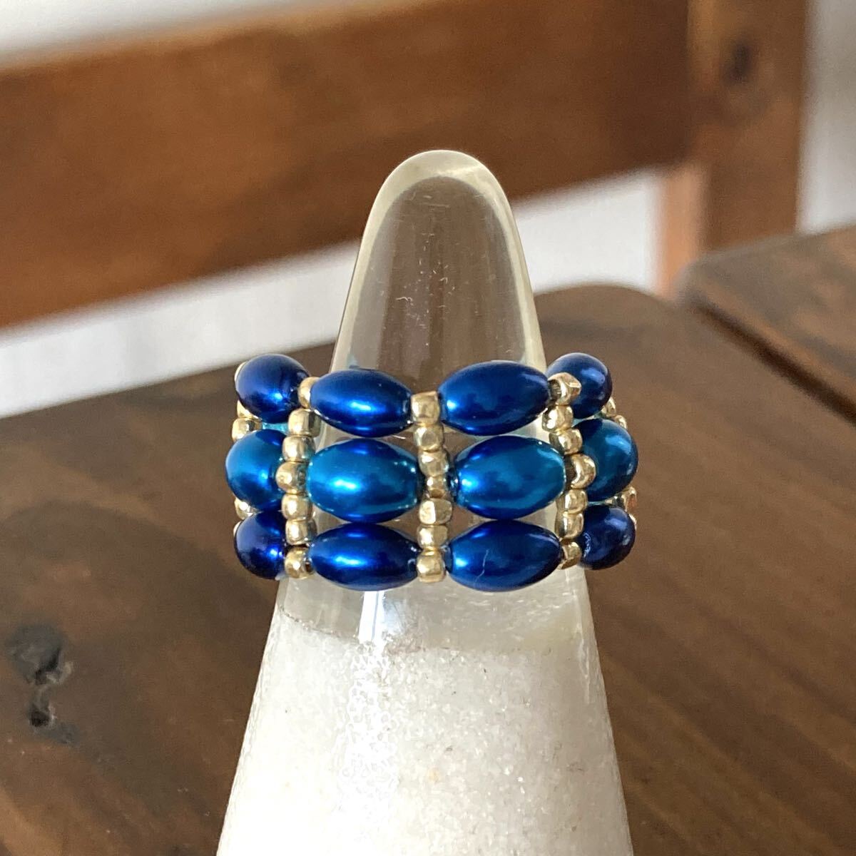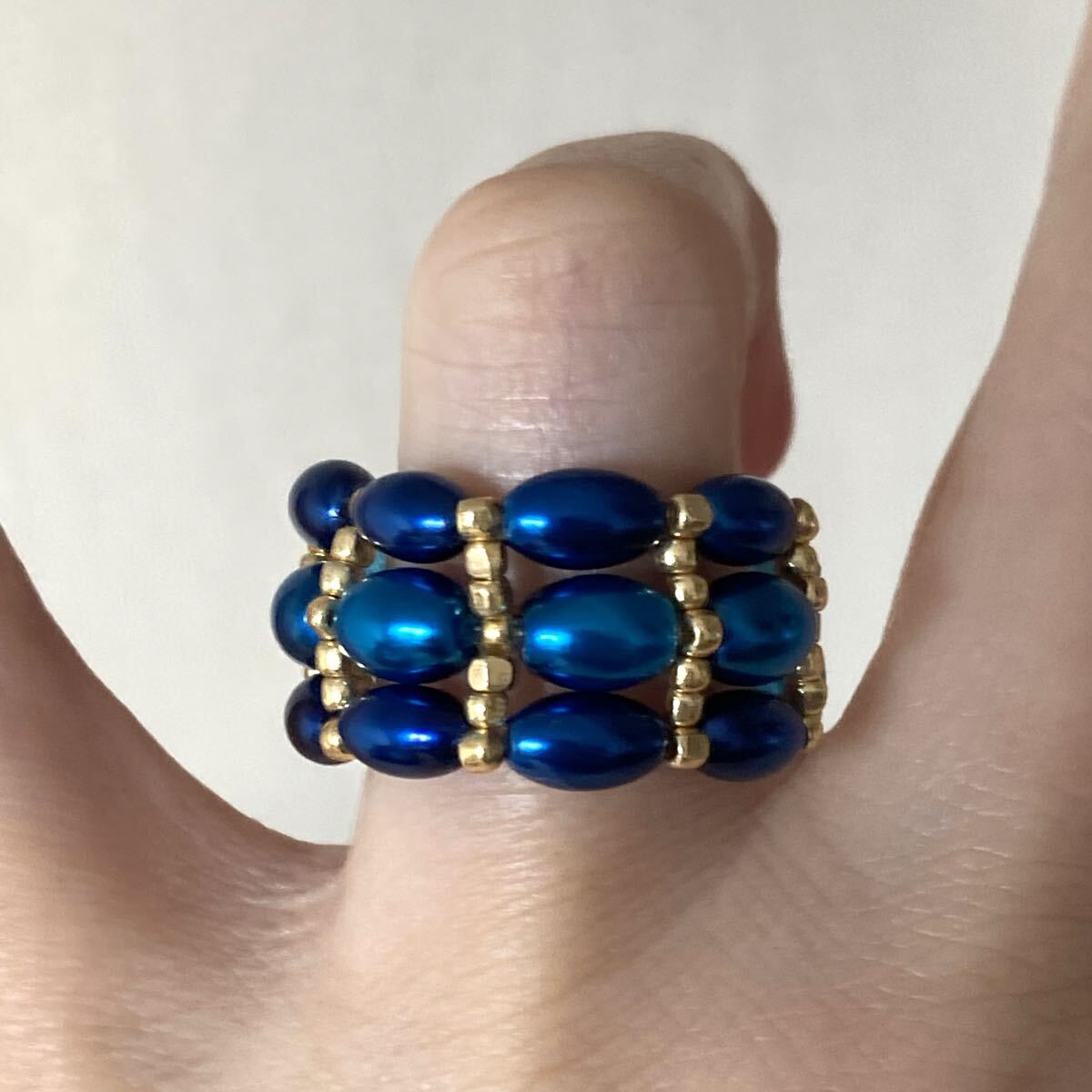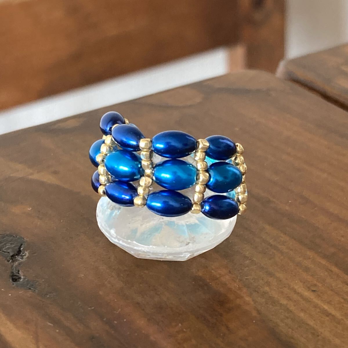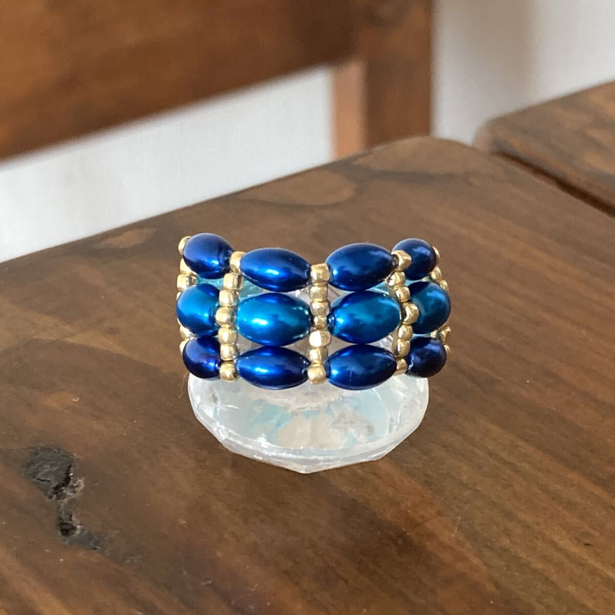 2色のブルーのナツメパールビーズを4列×3段に並べたデザインののリングです♪