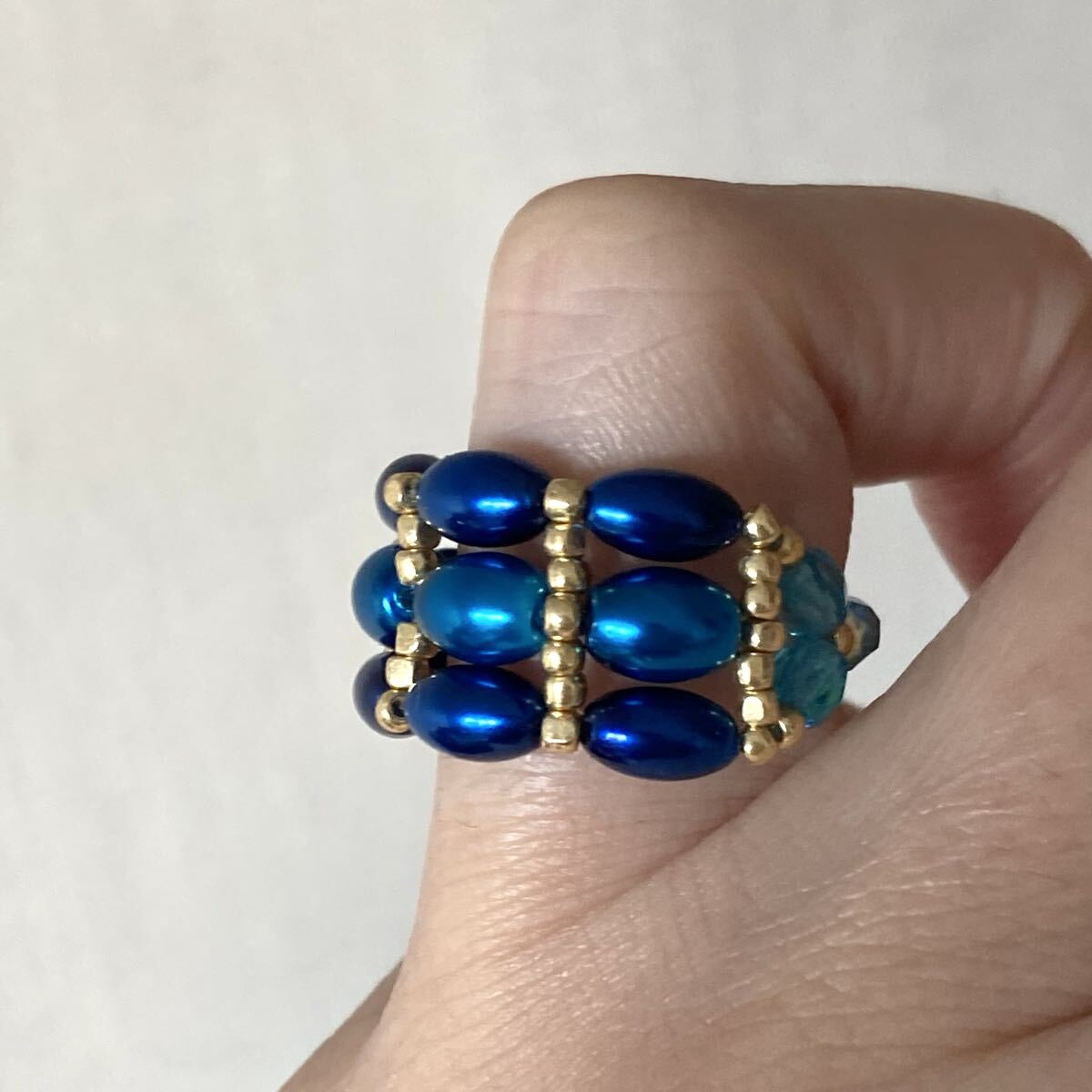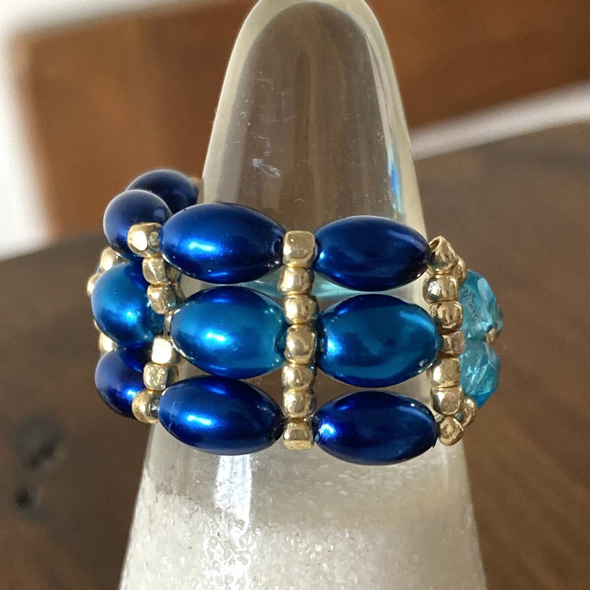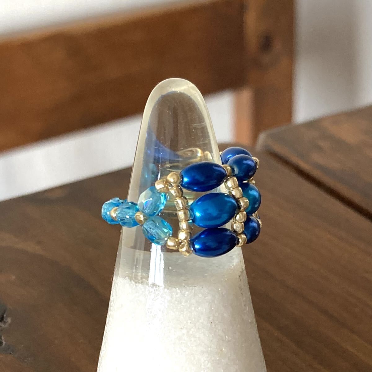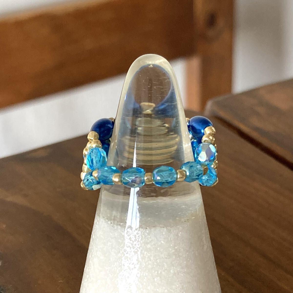 7mmの濃いブルーと薄いブルーのナツメパールビーズ、4mmの水色のチェコビーズ、ゴールドのスリーカットビーズで作ったリングです。