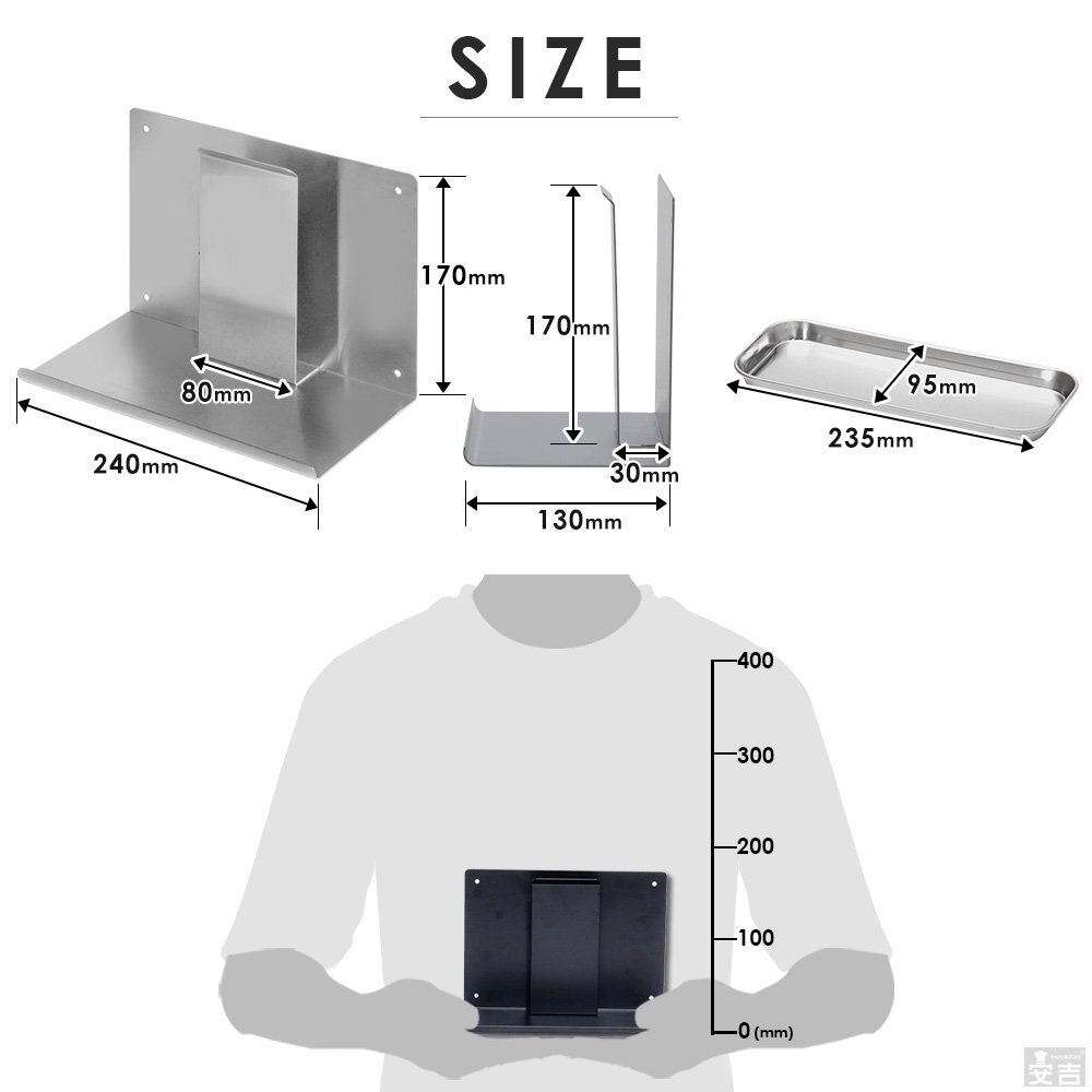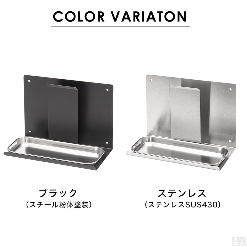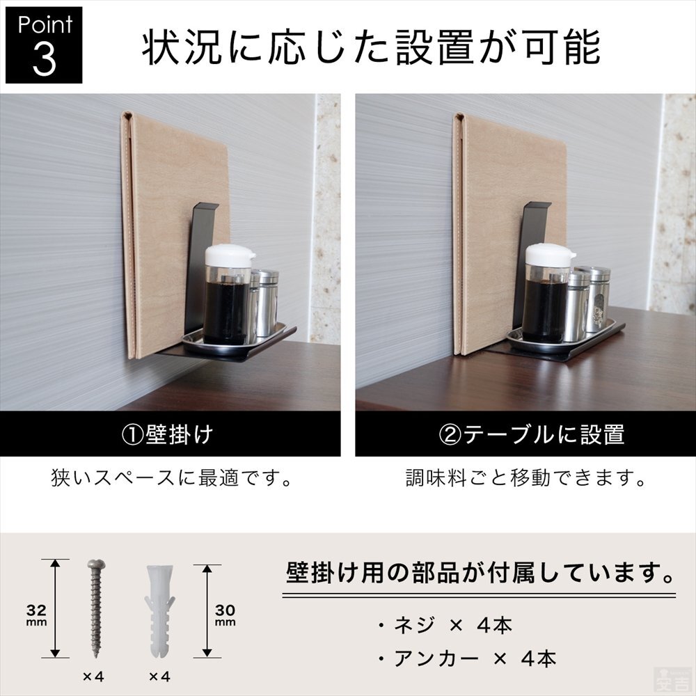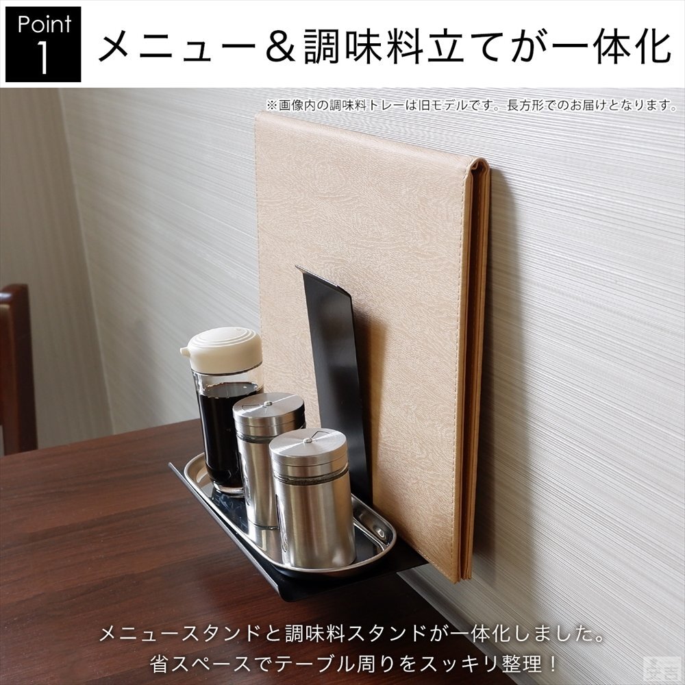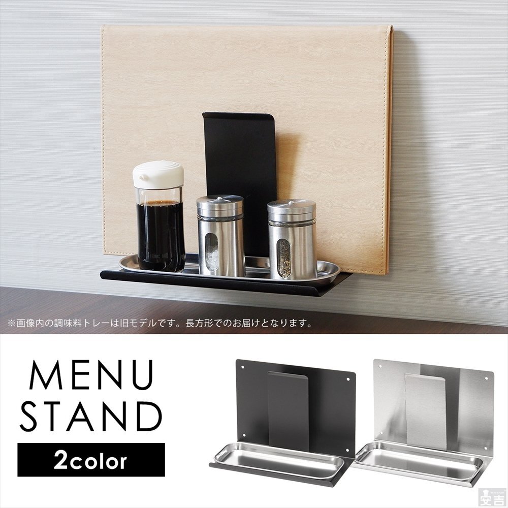 | 特長 | 客席のテーブルを有効的に料理を並べる為壁掛けタイプの調味料ラックプラス メニュースタンドを一体化。 シンプル構造でステンレスとブラックをご用意いたしました。 |