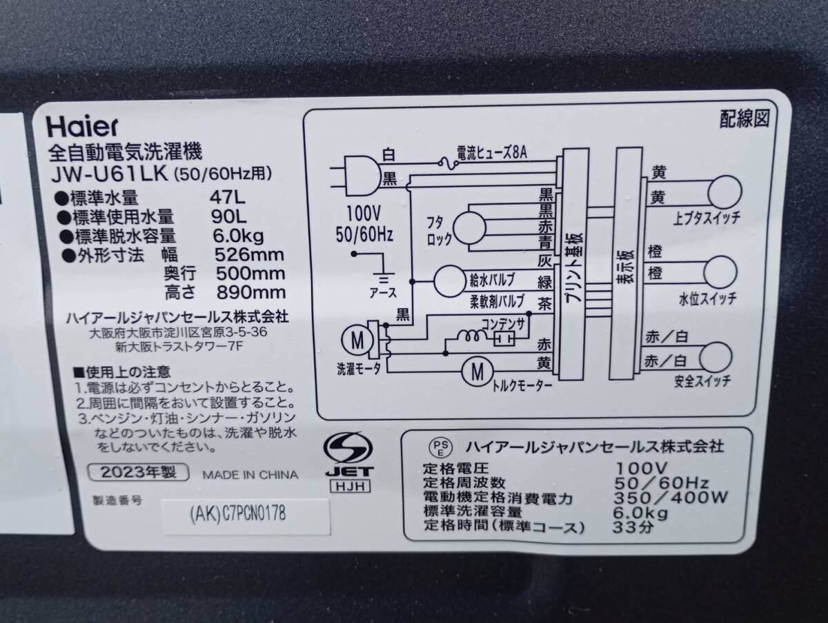 ■ [251202-2M]【現状/動作品】《洗濯機》Haier ハイアールJW-U61LK 6kg 2023年製 動作確認済み(自動投入除く) キズありの出品です。