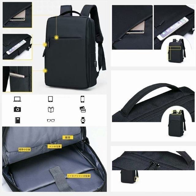【商品説明】 優れた機能性リュックサック 四角いボックス型みたい形状のリュックで無駄なスペースがなく、荷物を整理しやすい。リュックの外にはスマートフォン、傘、手帳、カードなどを収納する便利なポケットがいくつあります。内部に書類、水筒、着替え服などがきれいに収まります。独立した厚手のPC専用ポケットがあり、15.6インチのノートPCも収納可能です。衝撃防止で、大切なPCを守ってくれます。1~2泊程度の出張ならこのリュックは一つで対応出来ます。 【素材】ナイロン 防水性,耐摩擦性,耐久性に優れた 高密度ナイロン生地を採用しています。