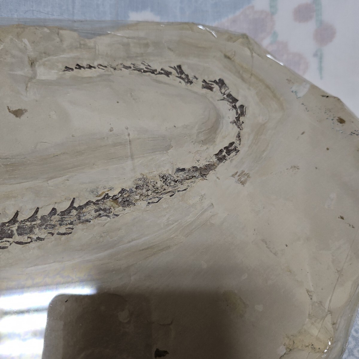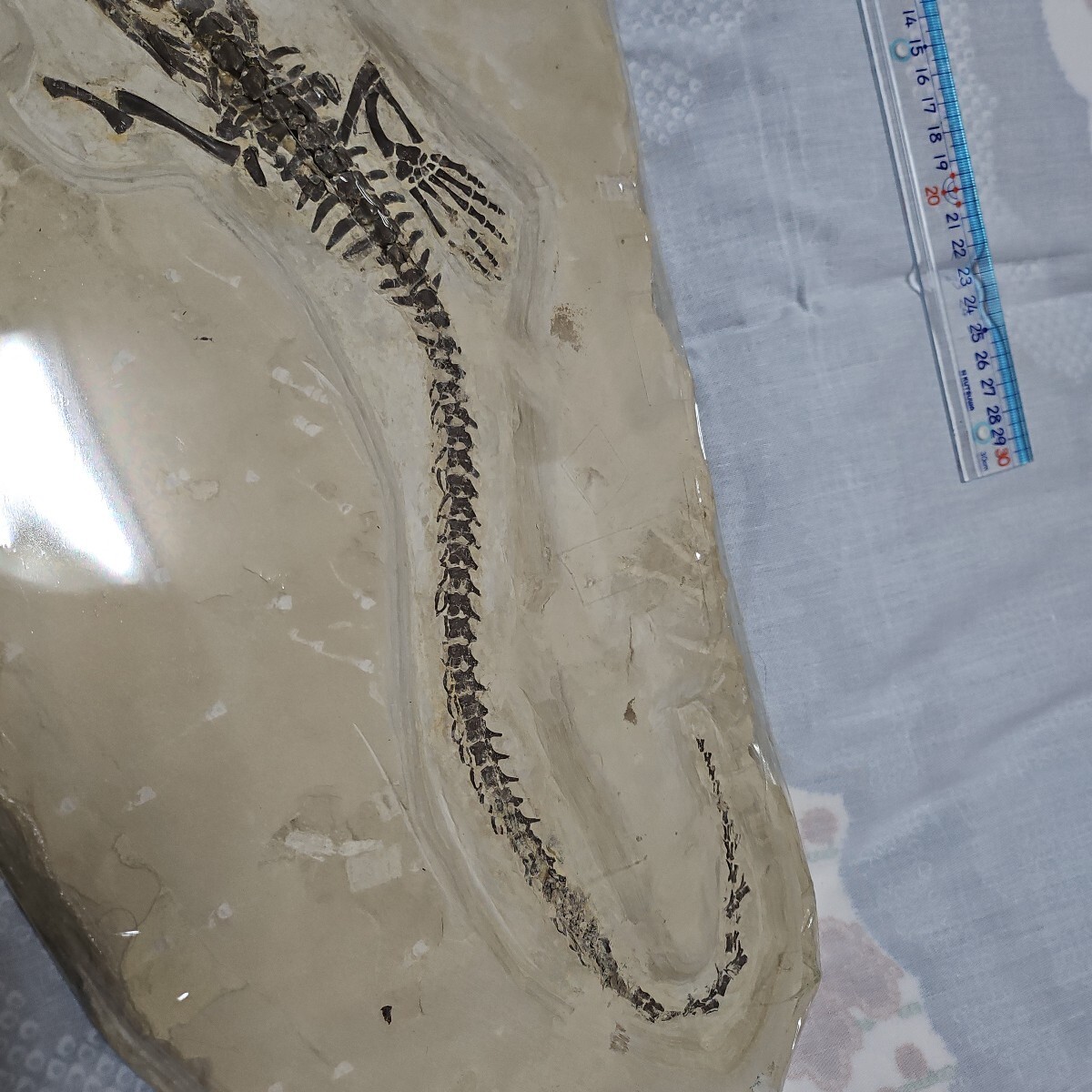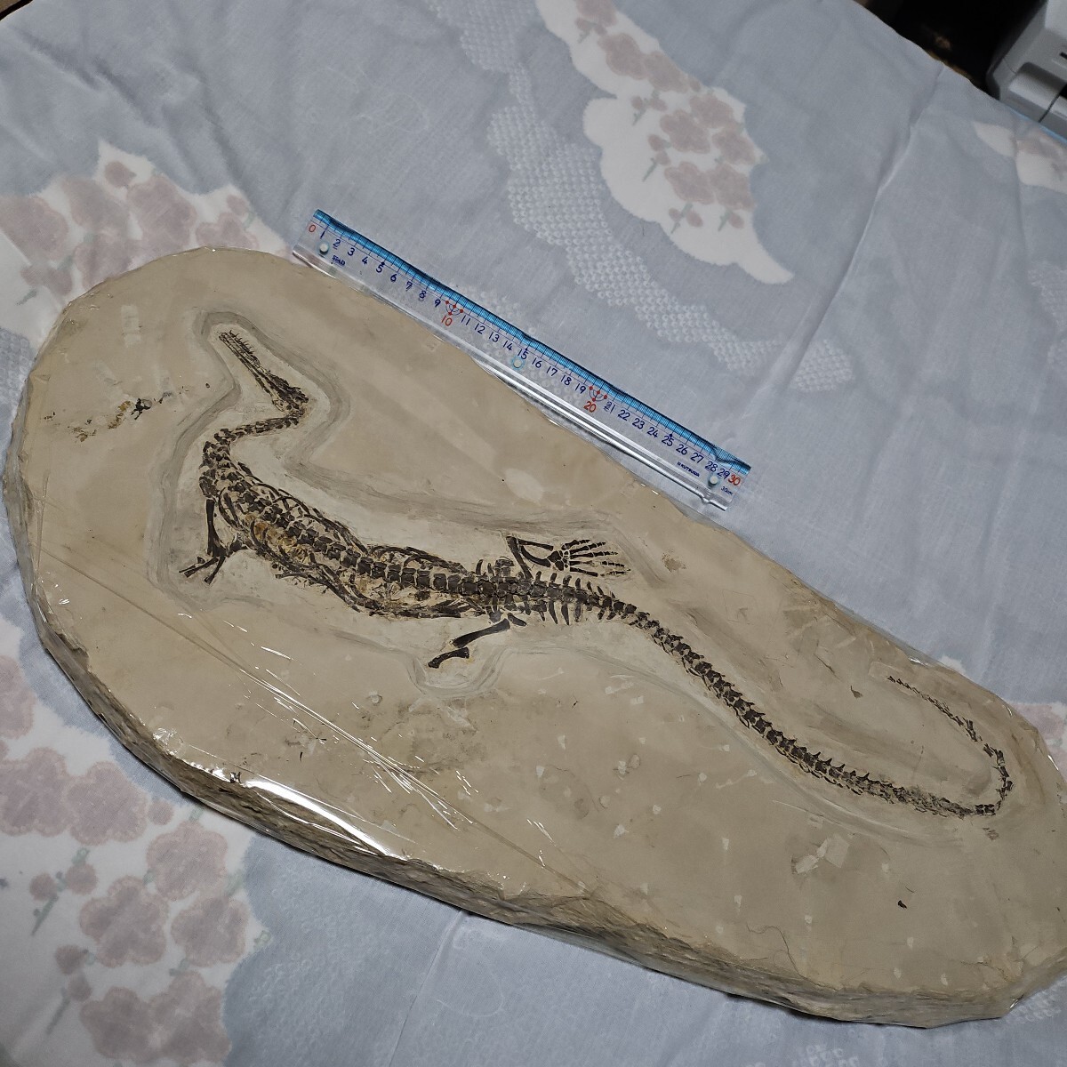 今回出品のメソサウルスは全長70cm程あり、ほぼ大人の成体であると考えられます、近年のミネラルショー等でもなかなかお目にかかれ無い大物です、頭部は綺麗に残っており、背骨はかなり立体感があります、40年程前に購入した化石になります。購入後、ラップで包んでおりますので化石の状態はほぼ当時のままであると思います。