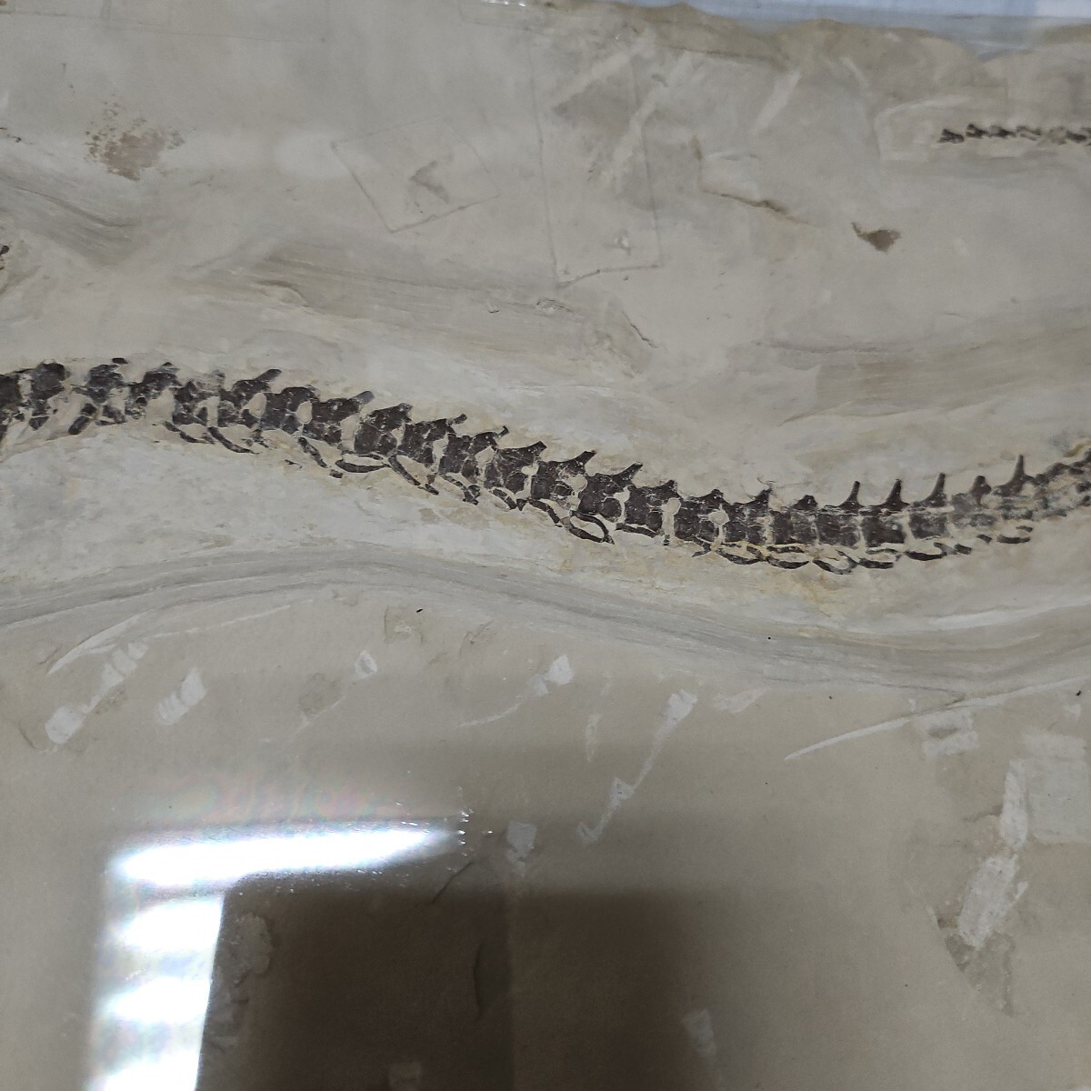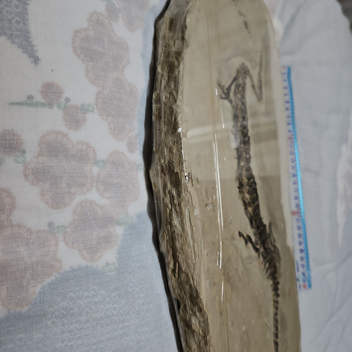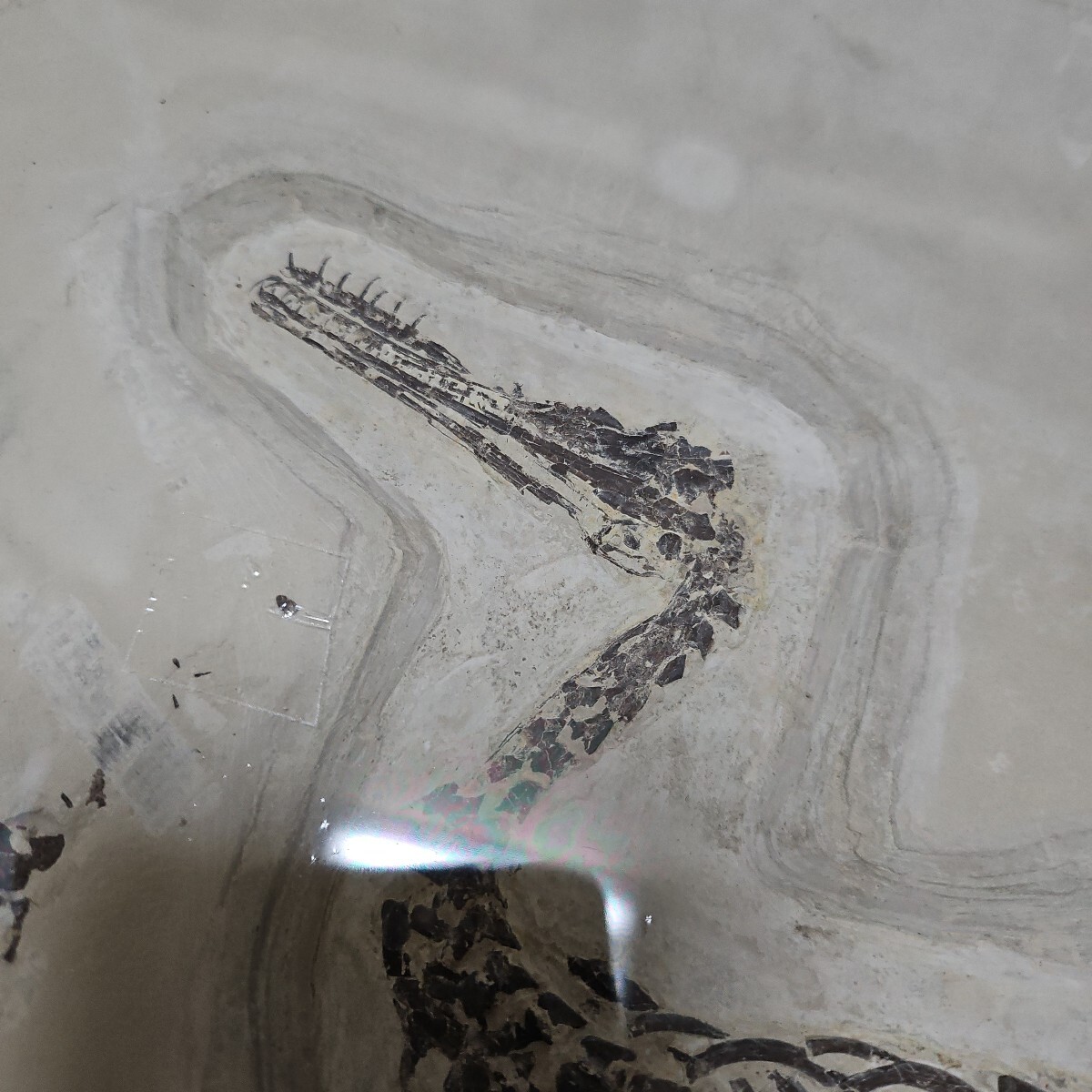 今回出品のメソサウルスは全長70cm程あり、ほぼ大人の成体であると考えられます、近年のミネラルショー等でもなかなかお目にかかれ無い大物です、頭部は綺麗に残っており、背骨はかなり立体感があります、40年程前に購入した化石になります。購入後、ラップで包んでおりますので化石の状態はほぼ当時のままであると思います。