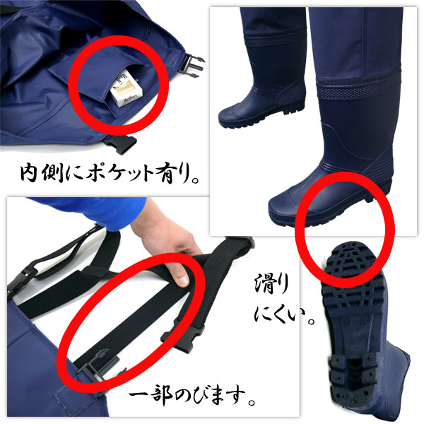 | 商品説明 | 防水スーツ ★川、池、海で使用可能。 釣り用スーツです ★バスフィッシングされてる方がよく着てますよね 田植え?釣り?水遊び? ★意外に洗車やワックスがけにも便利で、つい一生懸命になるあまり、ズボンのベルトやジャンパーのファスナー、ボタンなどで塗装に傷が付くのを防止できます その他あらゆる水場での作業に最適です ★便利なフロント内部ポケット付き 小物を入れるのにも最適です 靴裏も滑りにくい構造になっています サイズ:フリー(約) 本体 134cm(肩バンド含まず) 胴回り 136cm 又下 90cm 靴サイズ 28cm ※バンド調整で肩高最大170cm程度まで対応しております。 装備:ポケット×1 |