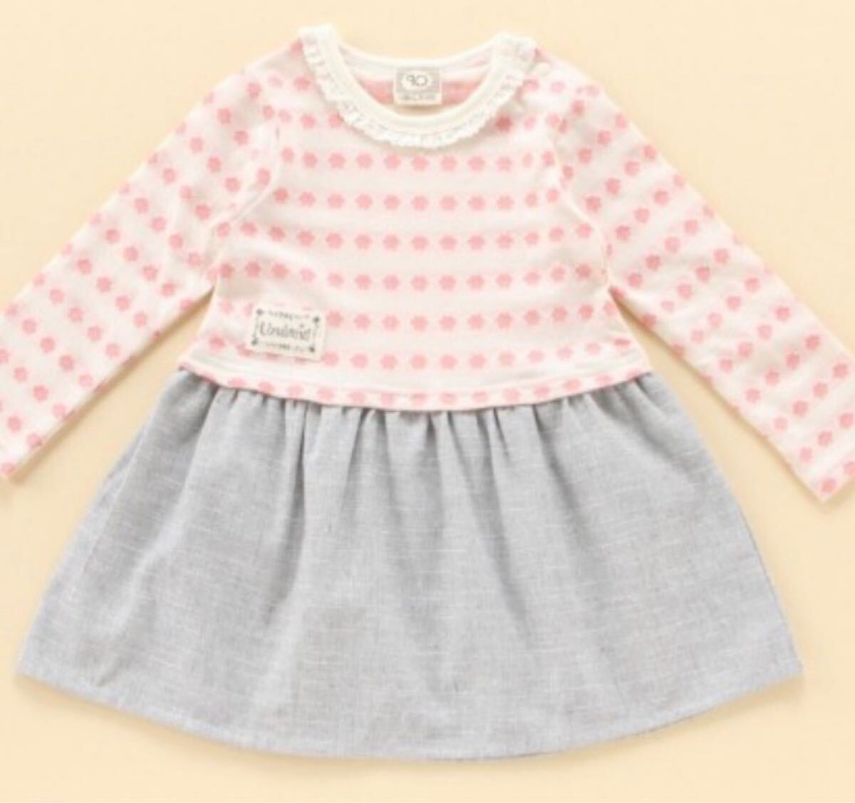 ベビー用の長袖ワンピースです。上部は白地にピンクのドット柄、下部はグレーのスカートになっています。襟元はフリルで可愛らしいデザインです。